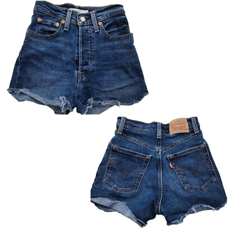 These trendy denim shorts were altered from full length “Ribcage” jeans In a like-new condition See photos for measurements and see the quality in this item Classic 5 pocket style & Button-Fly closure Semi-dark denim with gold grommets red Levi’s tag (back pocket) Ribcage = High Rise Size 24 waist 85% cotton 14% polyester 1% spandex Raw hemline Thank you for looking ❤️