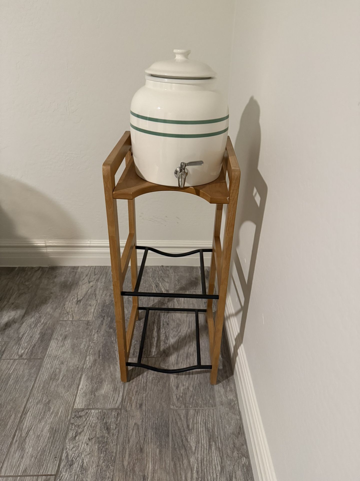Stand and crock (drink holder). Crock is made of ceramic and metal - no plastic. Stand can hold three 5 gallon jugs Total value for both items $159.99