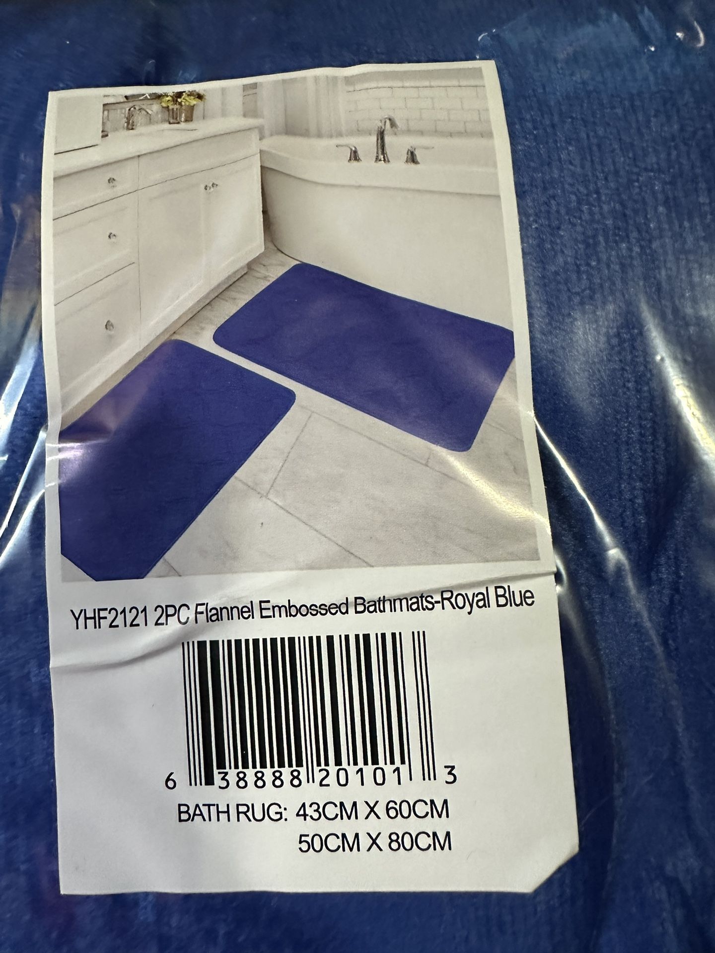Plush royal blue bathmats, 2-piece set. Flannel embossed design. Has two different sizes: one is 43cm x 60cm and other is 50cm x 80cm. Still in original packaging, never used. Nonslip memory foam.