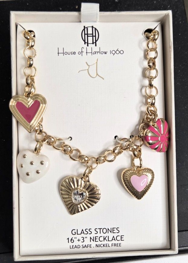 House Of Harlow 1960 Gold And Pink Heart Charm Necklace Valentines NWT. Excellent Condition Includes original box Weight: 9 oz wrapped and boxed