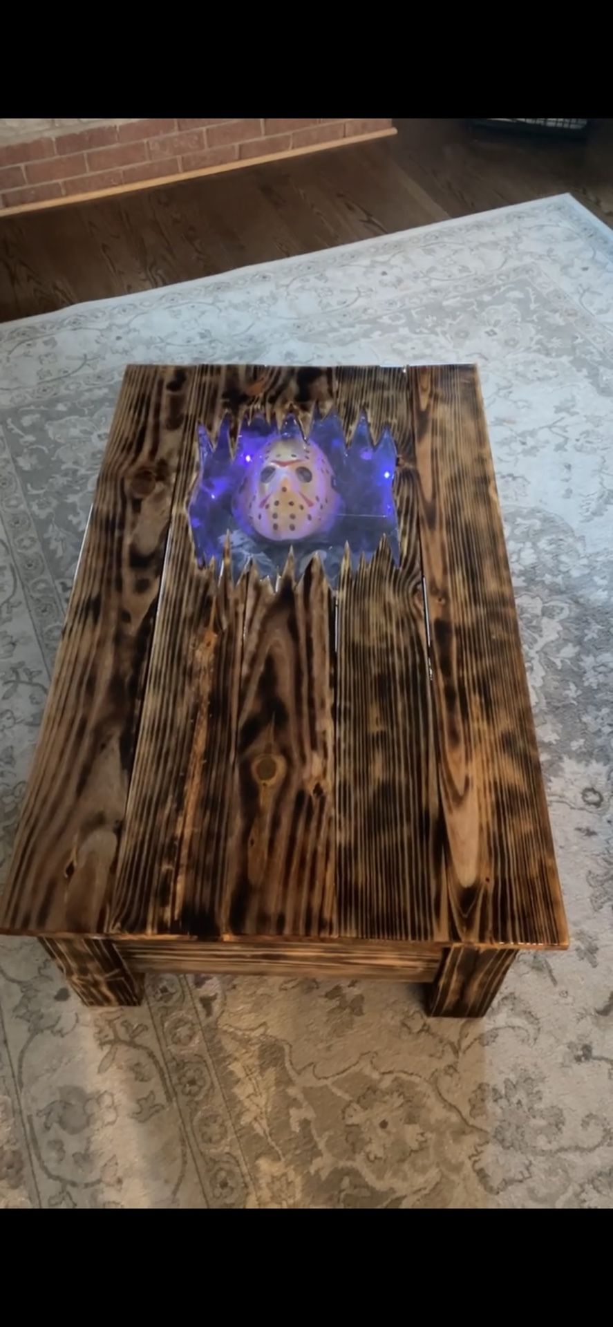 Coffee table that has Jason Vorhees in the center. From the movie Friday the 13th