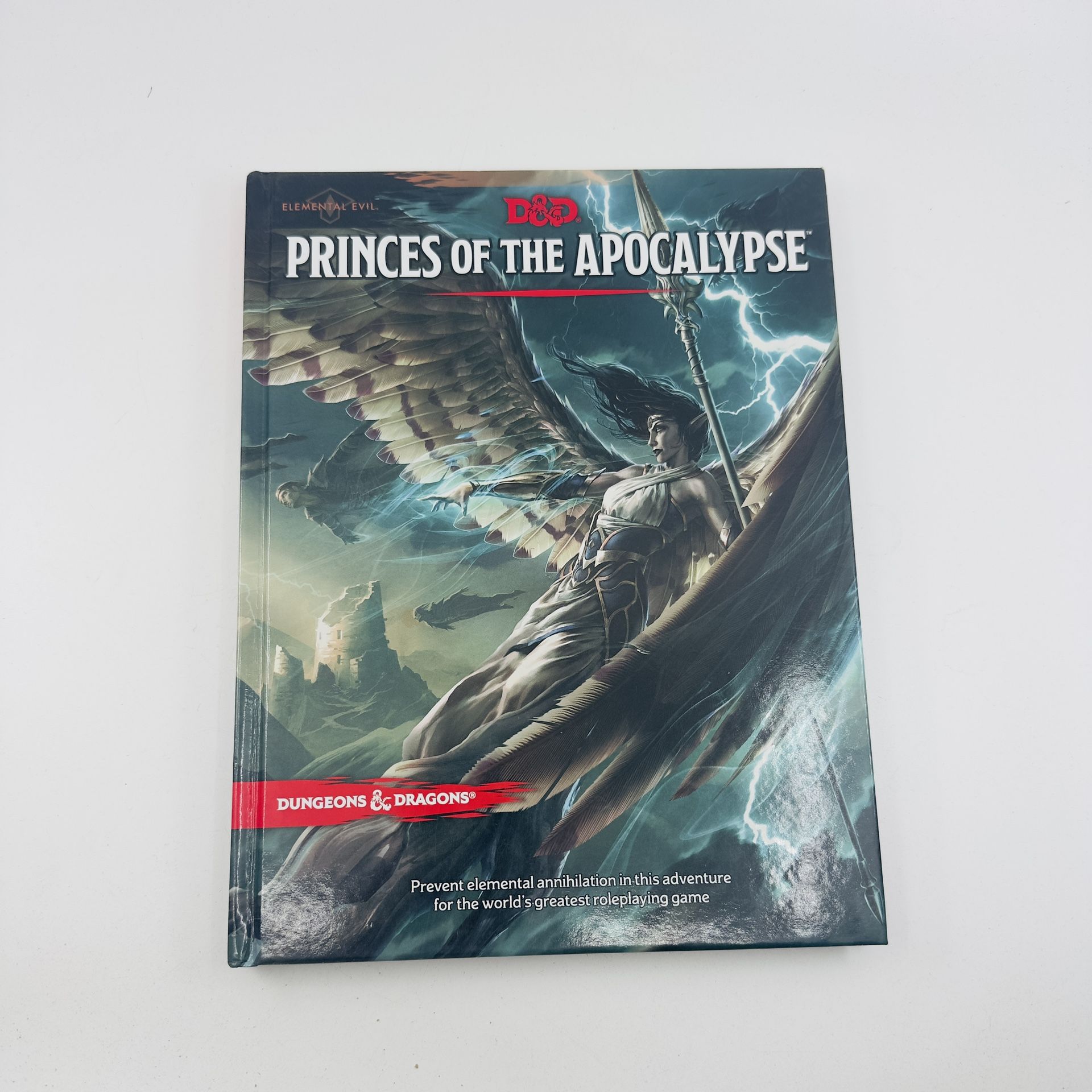 I purchased this book but never used it, letting go to someone that will. Product Description Abolish an Ancient Evil Threatening Devastation in this Adventure for the World’s Greatest Roleplaying Game Called by the Elder Elemental Eye to serve, four corrupt prophets have risen from the depths of anonymity to claim mighty weapons with direct links to the power of the elemental princes. Each of these prophets has assembled a cadre of cultists and creatures to serve them in the construction of four elemental temples of lethal design. It is up to adventurers from heroic factions such as the Emerald Enclave and the Order of the Gauntlet to discover where the true power of each prophet lay, and dismantle it before it comes boiling up to obliterate the Realms. • An epic adventure for characters levels 1 – 15, the Elemental Evil™ story arc, Princes of the Apocalypse provides everything a Dungeon Master needs to create an exciting and memorable play experience. • Includes new elemental spells and the element-touched genasi as a new playable race. • Fans of the Dungeons & Dragons® Roleplaying Game can get a sample of what this product has in store for them through the D&D Encounters™ in-store play program. • Adventure design and development by Sasquatch Game Studio LLC.