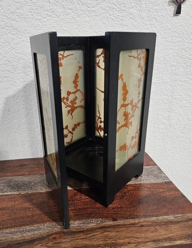 Party Lite Sakura Lantern Cherry Blossom Gold Black is in good, clean condition. No scratches or chips. Beautiful Candle Holder. Contemporary twist on a classic Asian theme. Wooden lantern with four glass panels designed with a cherry blossom pattern. Simple magnetic closure. Includes glass votive cup. 11" h. For use with votives, tealights, tealight tree, round pillar, mini ball, ball 3", jar and mini jar candles