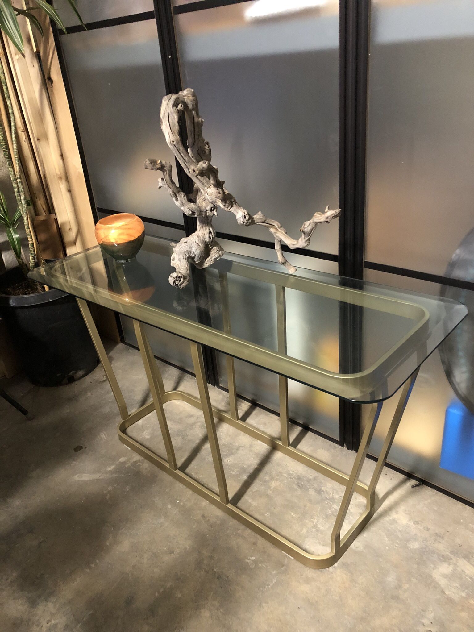 Reproduction mid century brass and glass entryway table, base is gold painted metal, top is a 3/8” thick glass with a 1 1/4” bevel, 48”W x 18”D x 25.5” H, I’m excellent condition, we can deliver