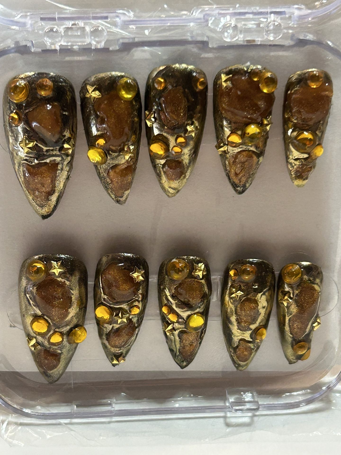 Gold with orange rhinestones nails…. Size:Large $12