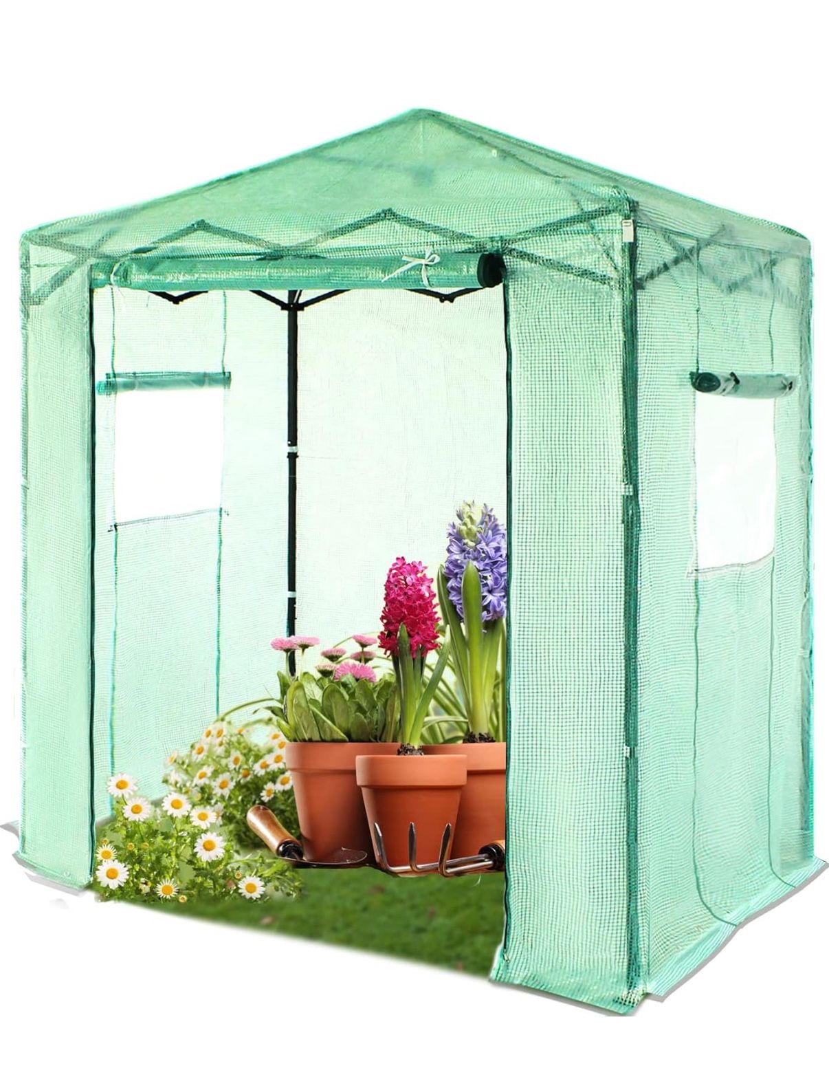 Brand new in box EASY SETUP: Innovative easy setup technology allows ONE PERSON to set up this greenhouse in seconds. pop-up greenhouse is ready straight out of the box. It glides closed just as easily as it goes up BUILT FOR ALL SEASONS: The heavy-duty steel frame provides durability and stability, giving you peace of mind even in challenging outdoor conditions. The powder coated, rust resistant frame is made with more steel than other models. Reinforced with wind ropes and stakes, it is the ultimate solution for long lasting use even in tough weather. Set it up in your backyard, patio, garden, or even indoors PROTECTIVE PE COVER: This portable greenhouse kit includes a high-quality, plant-safe, water-resistent and UV-resistant PE cover designed to maintain humidity levels and ensure just the right amount of sunlight for your garden; perfect for creating a healthy growth environment in any season for your flowers, herbs and vegetables to thrive SPACIOUS WALK-IN DESIGN: Step inside this spacious 6x4 walk-in greenhouse, allowing you to move freely while tending to your plants. This green house can accommodate our custom fit shelving units to maximize your plant capacity (ASIN: B08ZJ8H558), creating an efficient use of space. The zippered roll-up doors and mesh windows are designed for ventilation and safety from small animals