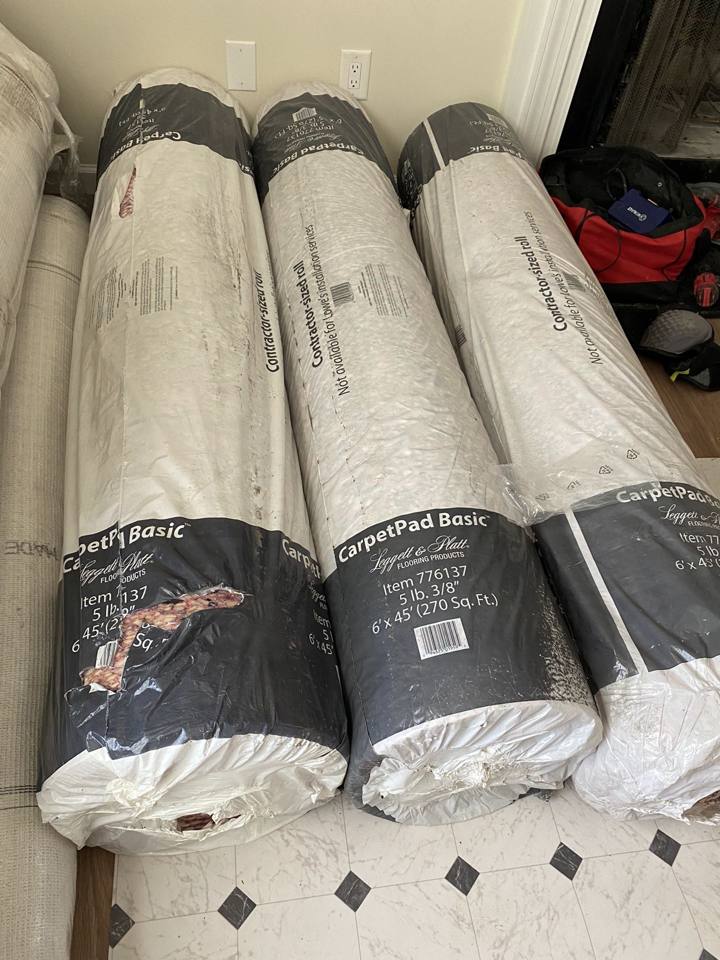 Brand-new carpet padding still wrapped up never used. Recently bought too much Padding. Each cost us $83.00 Take both for 65. Or $55 per single roll. Each role has 270 yd.². That’s a total of 540 sq yards. The reason the packaging says not for installation from Lowe’s is because they use subcontractors for carpet installation. You purchased the carpet from Lowe’s and the padding comes from a subcontractor not from Lowe’s.