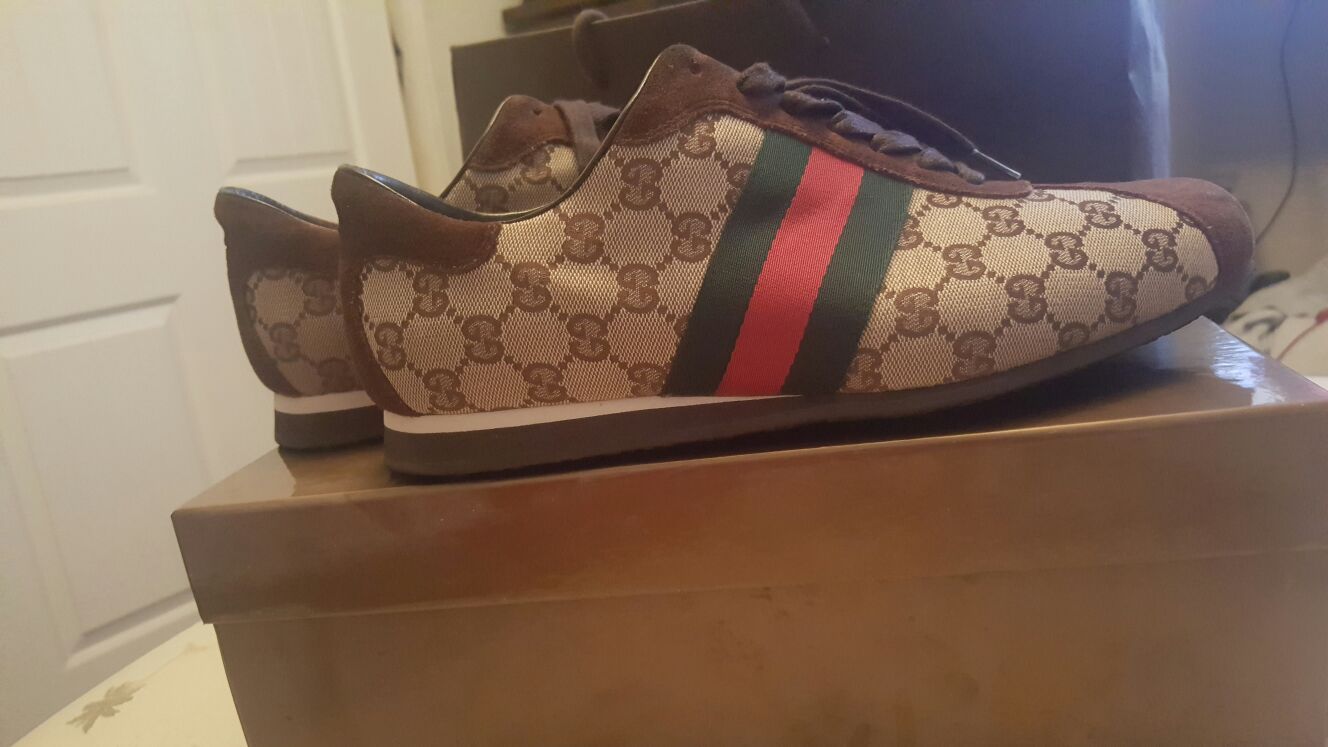 100% authentic gucci shoes have receipt to proof.... khaki and brown suede only worn them twice ..has extra laces that ive never use still in the package.and also on its original box and original bag , and individual shoe bag ... 9 1/2 size but will fit if youre a 10 too.. one shoe has 2 water drops as shown on the pic but still are looking good... offer me... only serious inquiries....no trades....lowballers will be ignored...no bs...all sales are final...