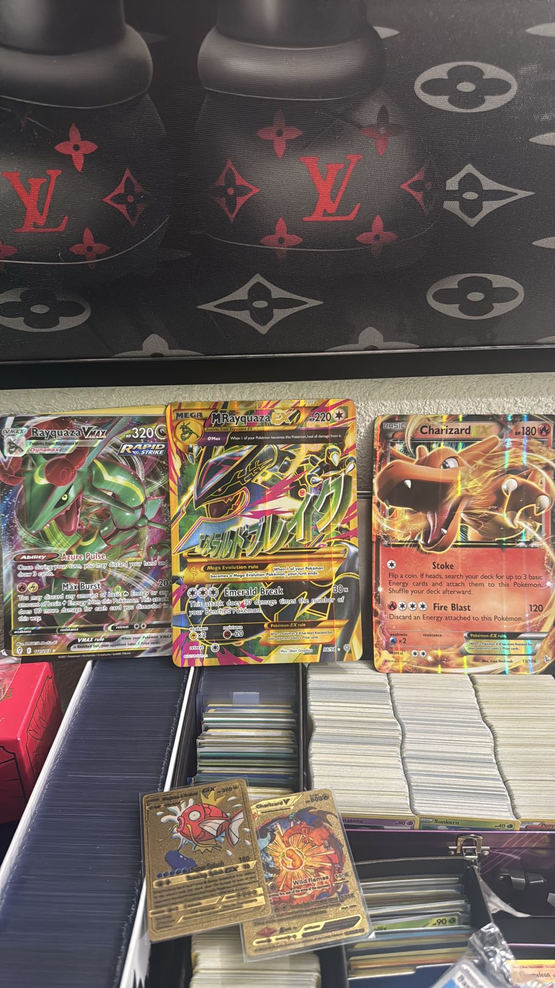 Huge lot. Long box is different types of holos, binder is mixed couldn’t fit them all in pics, few jumbo cards, sleeves, dice, & ton of common & uncommon cards have few V Cards & pack of penny sleeves I will throw in. Most NM.. Open to offers.