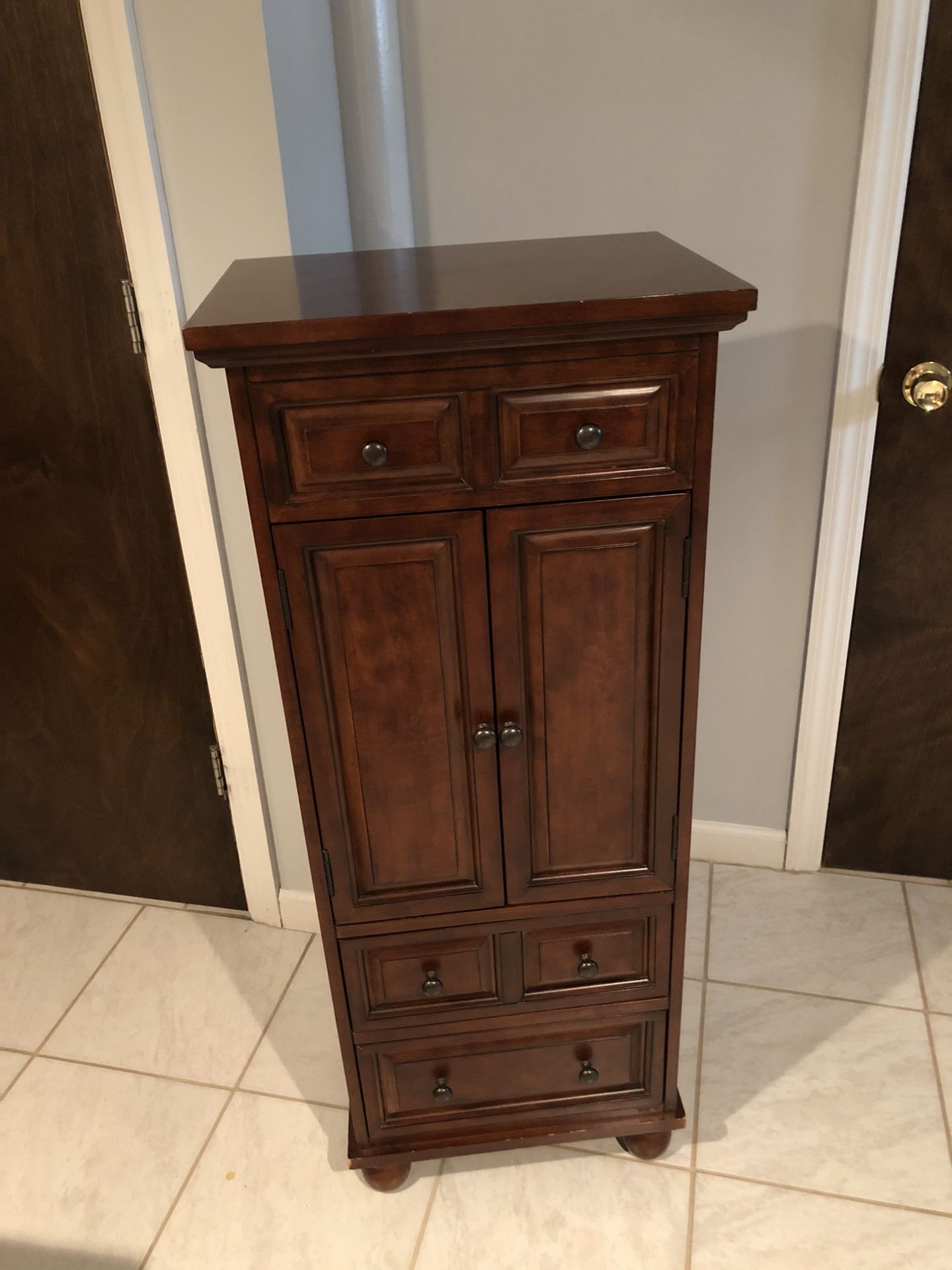 Jewelry console with multiple drawers for storage. The top opens as well for additional storage of smaller jewelry such as rings etc. Price is negotiable.