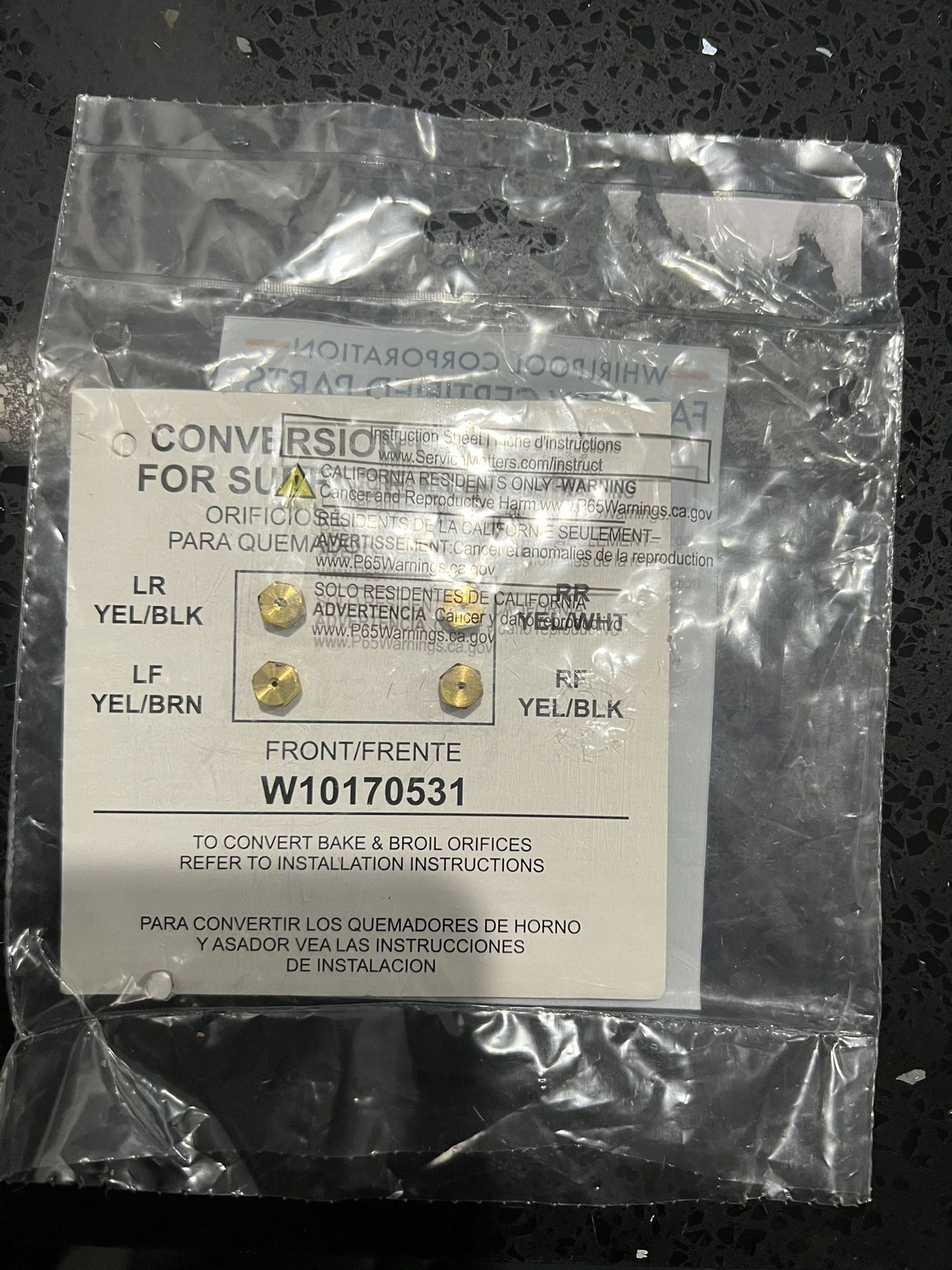 WPW10170531 LP conversion kit for Maytag and whirlpool, Amana, Inglis. This converts from natural gas (NG) to Liquid Propane (LP)