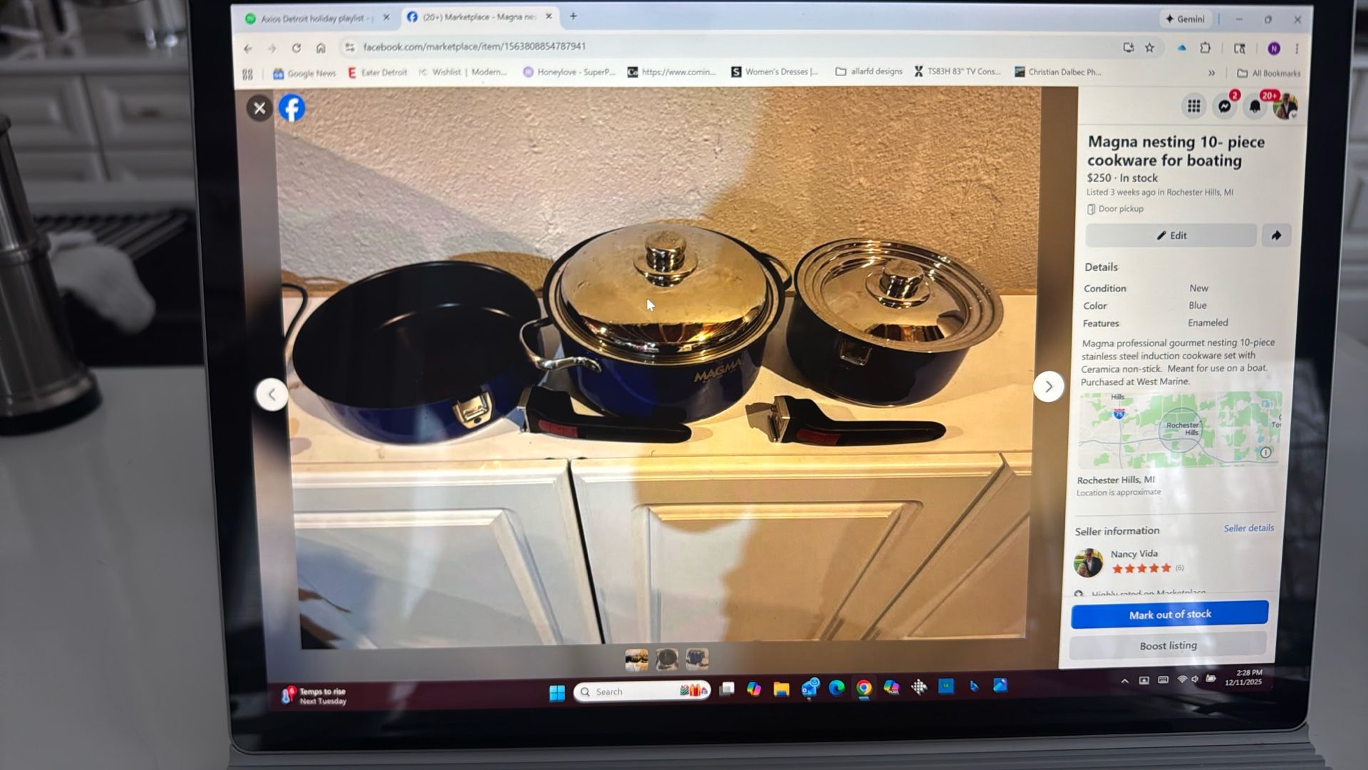Magna professional gourmet nesting 10 piece stainless steel induction cookware set with ceramic blue exterior non-stick Interior. Meant for use on a boat. Purchased at West Marine. Retail for $450