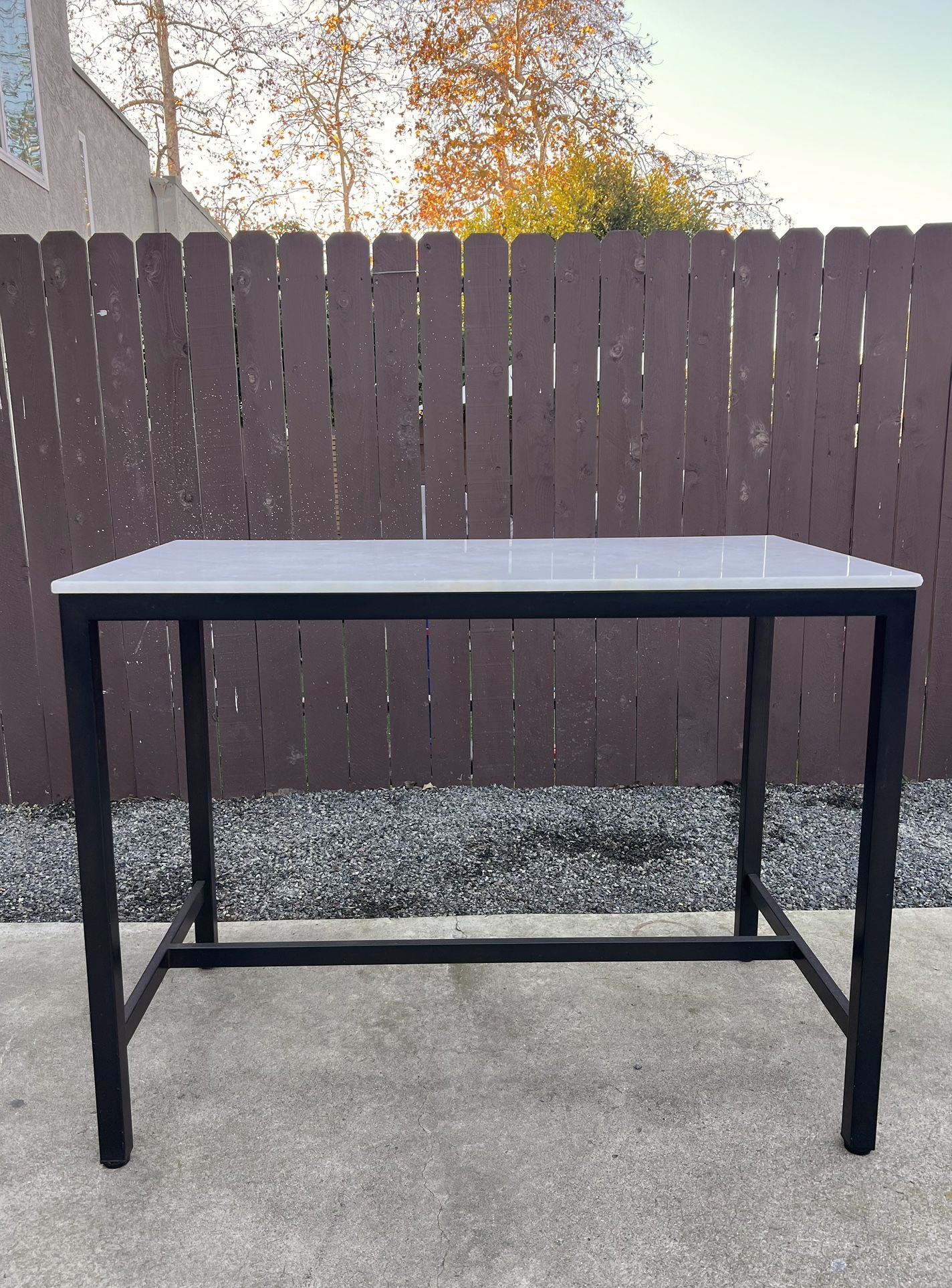 Modern counter-height table with a solid marble top originally from World Market and a black metal base. Overall in great condition, with minor wear on one corner of the marble (purely cosmetic and visible in photos). Dimensions: 26” D x 48” W x 42” H Clean, minimal design that works well as a kitchen table, bar-height dining table, or workspace. Sturdy, heavy, and well made. Smoke-free home. Pickup only.