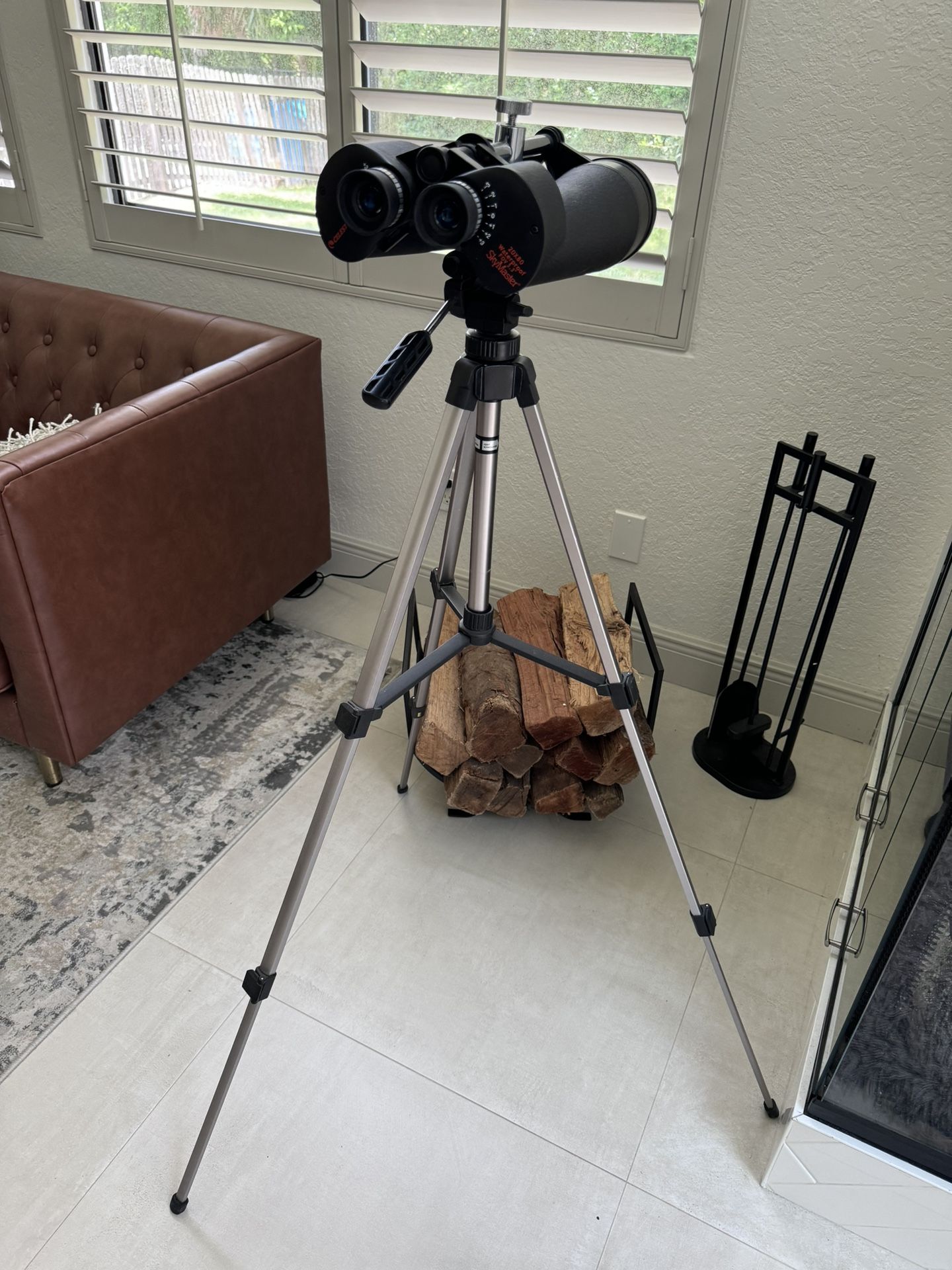 Celestron – SkyMaster Pro 20x80 Binocular – Outdoor and Astronomy Binocular – Large Aperture for Long Distance Viewing – Fully Multi-coated XLT Coating – Waterproof, Ambico Tripod, Tripod Adapter and Carrying Case Included. Used them as decoration. Like new! Moving. New over $350. Great deal.