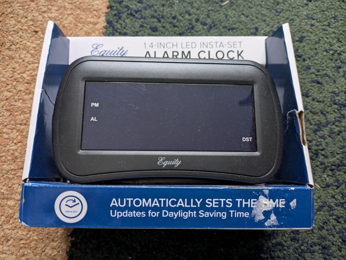 For sale: Brand new, still in the box Equity by La Crosse 1.4-inch LED Insta-Set Alarm Clock. This clock is perfect for anyone who wants a reliable and easy-to-use alarm! Features a clear LED display and automatically sets the time, with updates for Daylight Saving Time—no manual adjustments needed. I tried a lot of alarms, and this is the only one that can wake me up—works like a charm! It’s wire-powered (electric), so you don’t need to worry about batteries. Price: $10 Location: Lake Stevens Pick up only. Contact me if interested! Related Keywords: digital alarm clock, Equity by La Crosse, new in box, Insta-Set alarm clock, automatic time setting, LED clock, reliable alarm, Lake Stevens, $10, Daylight Saving Time, wire-powered clock