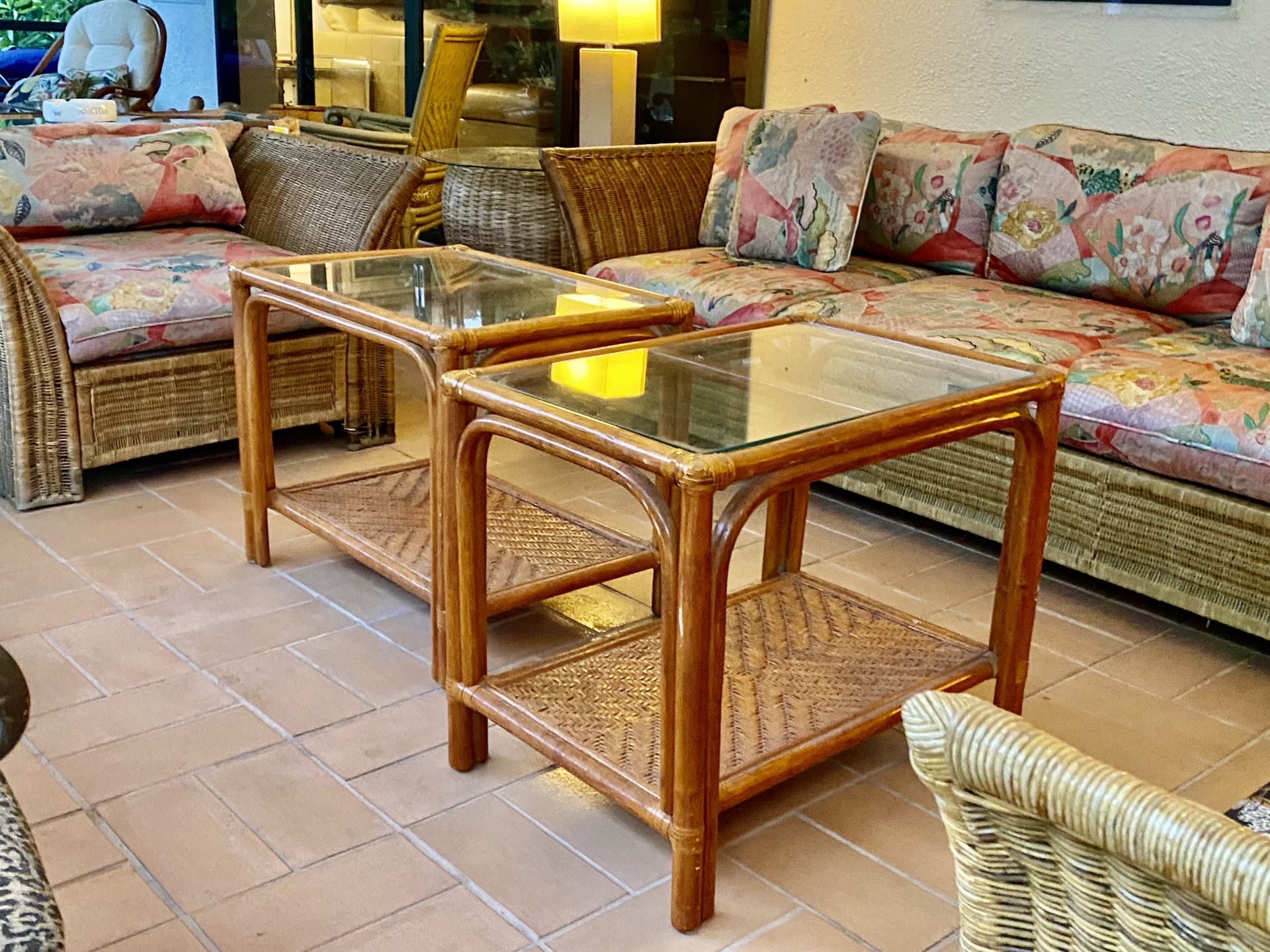 Great pair of tables w glass top and bottom shelf