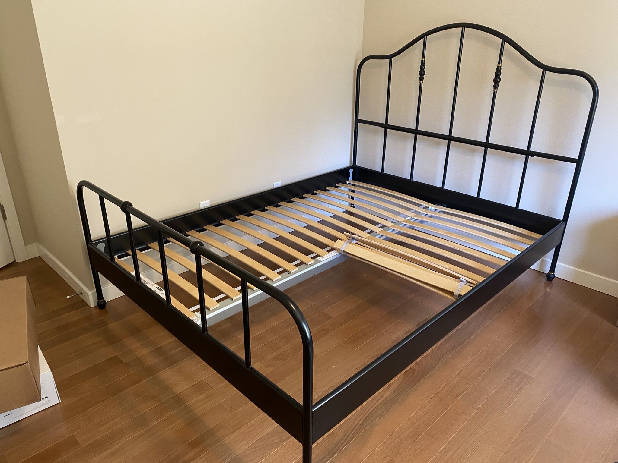Moving sale. Very very new and rarely used queen size bed mattress, slats and metal frame. Used total a month. Mattress is stored in a plastic bag, there is no stain, very clean. I can take off the plastic for you to check if you are willing to buy. frame has already disassembled. If you are nearby, i can consider for delivery.