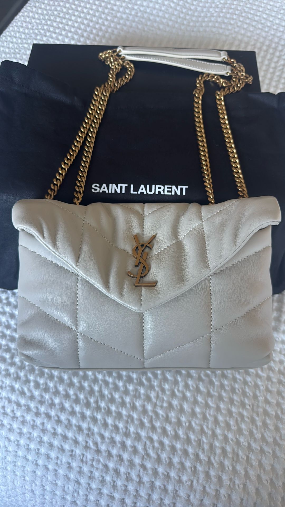 Authentic YSL LouLou puffer in cream with gold hardware. Full inclusion. COA included. Like new, never used, in excellent condition. More photos available upon request. Serious buyers please. Cash or Zelle accepted.