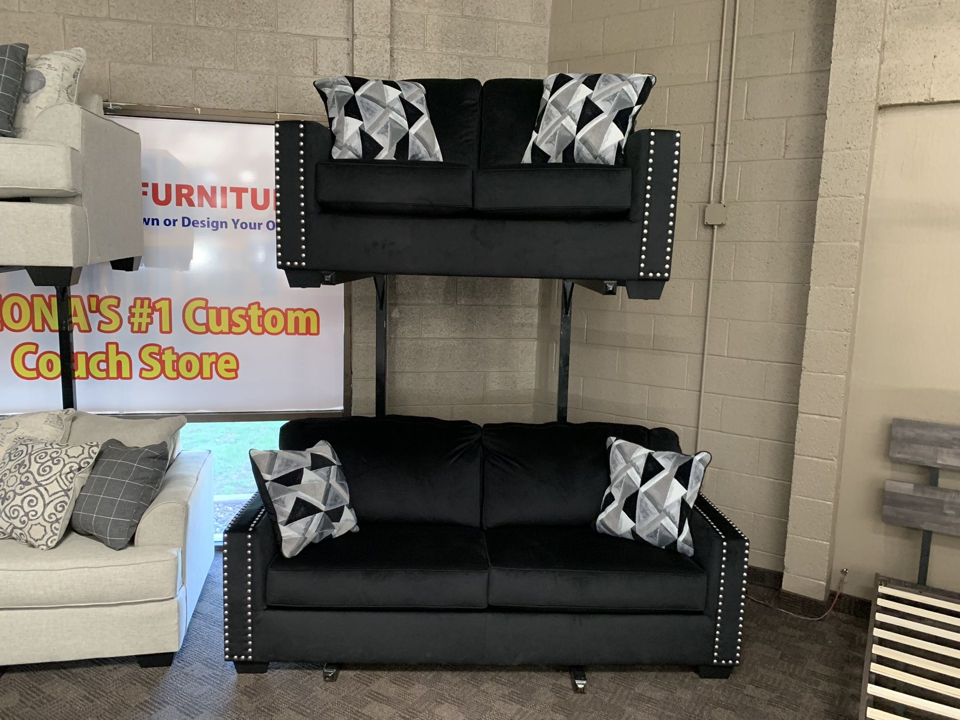 Brand new black sofa couch set. Soft black fabric. Silver nailhead trim. Very chic, clean lines. Delivery and financing available