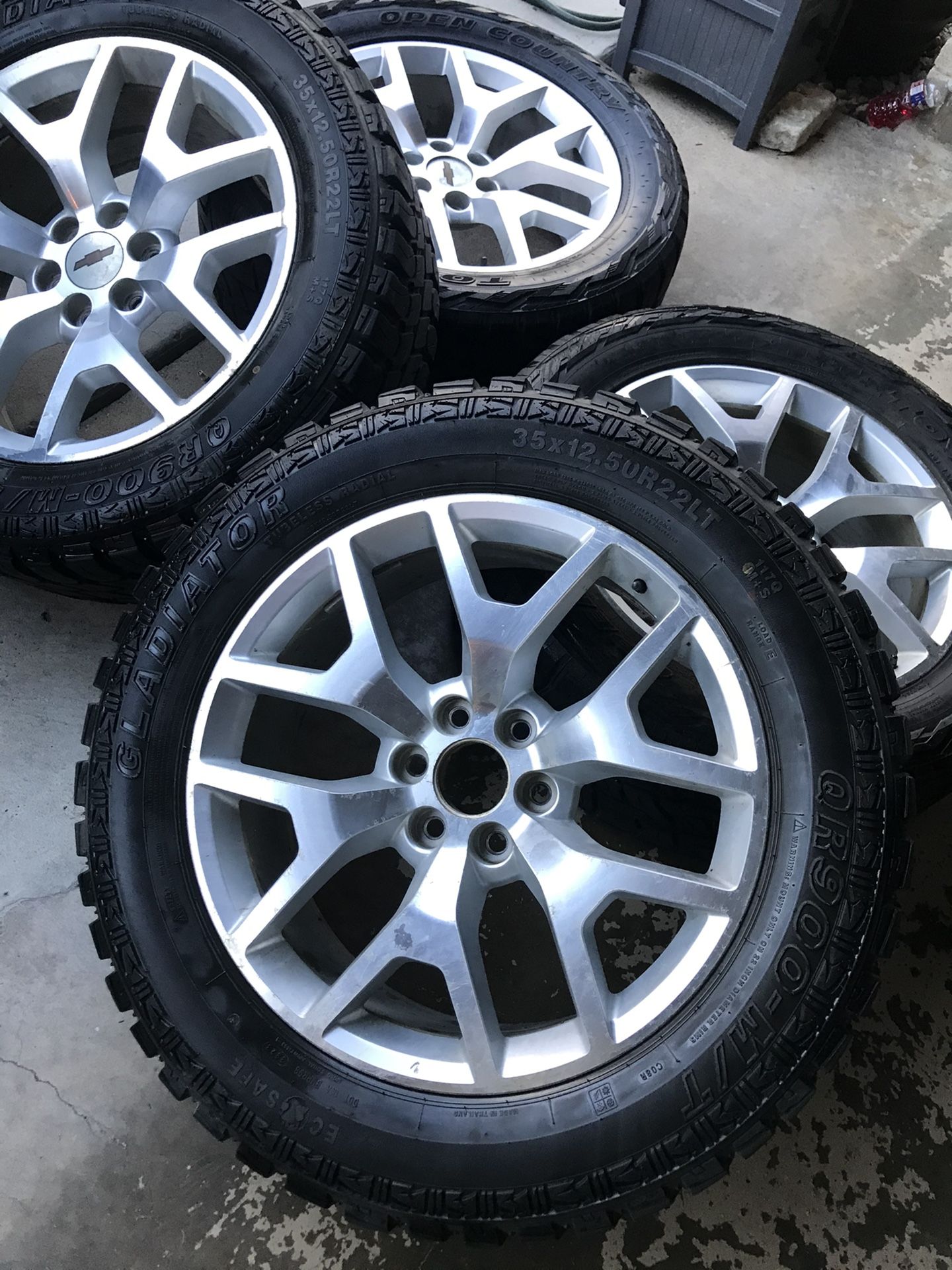 Have a set of 22” Honeycombs on 33x12.50R22 tires all around - 2 Toyo tires with 70% life 2 Gladiator with 85% life - $750 for the complete set