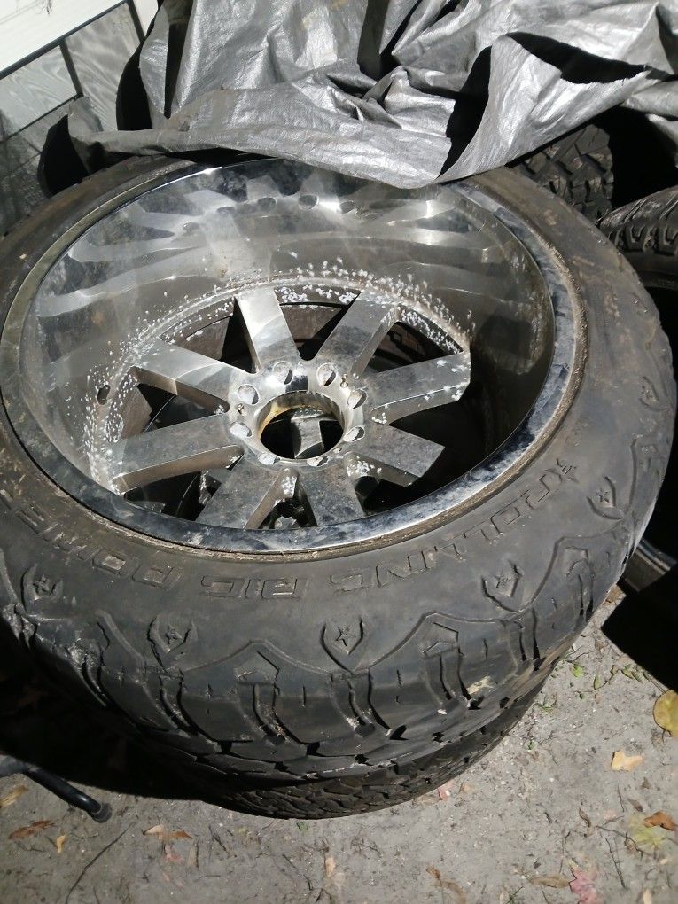 Rims have some pitting but can be buffed out i believe or cleaned up pretty good. 3 tires are new 1 is 40% tread... I got em out of a storage unit.$..1000..obo..or trade for gold jewelry or anything else that might catch my eye