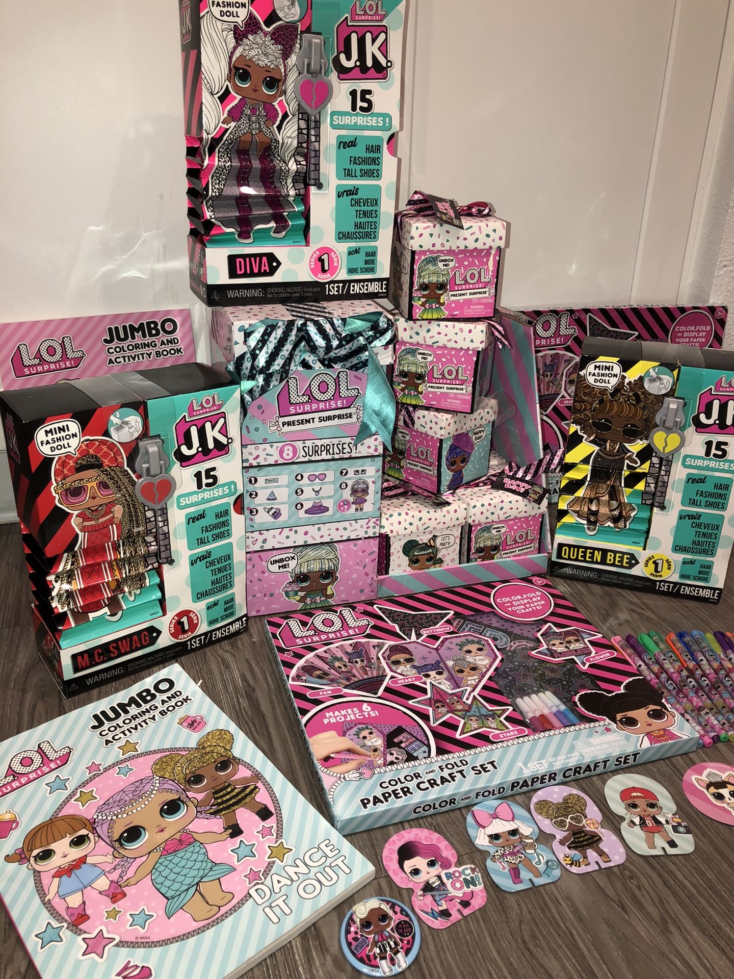 Lol surprise bundle! Everything pictured above you will get! 7 lol surprise dolls present surprise these are new but the box has been opened to see what lols were inside and in this bundle there are no doubles!! You will get 3 lol J.k. Dolls MC SWAG, DIVA and QUEEN BEE brand new never opened. You will receive lol surprise color and fold paper craft set that makes 6 projects and comes with markers. You will get a jumbo lol surprise coloring and activity book. 13 lol surprise milky pens and 4 dress up dolls, 1 lol surprise pen to wear and 2 lol surprise things to paint. This would be a great gift to give to your kiddo for Christmas or birthday present!