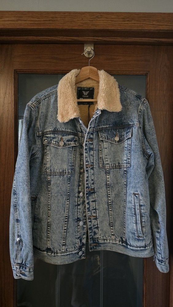 New. Unused with tag attached. Denim Sherpa Jacket - Medium Wash Size L Original price $145 I am size M usually (M was running tighter) but this size L fits better