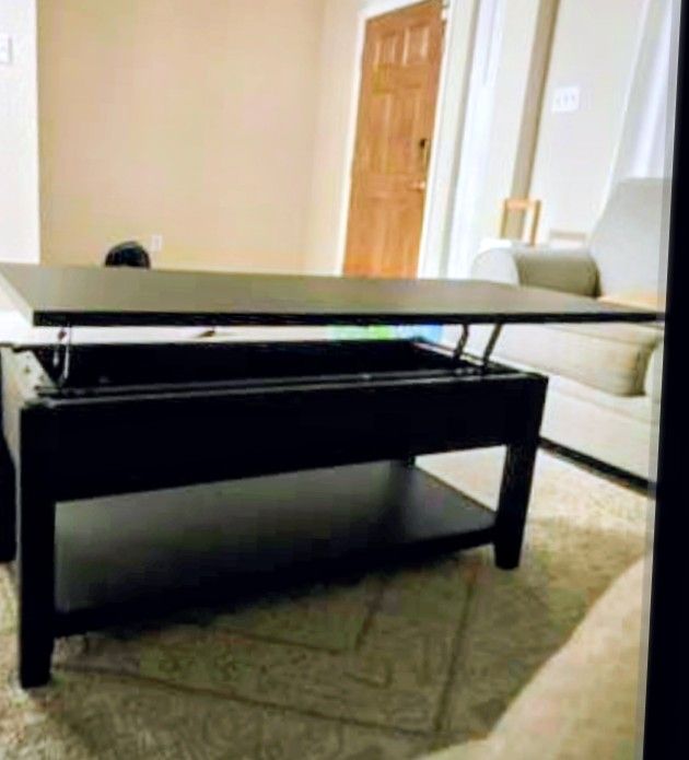 The Mainstays Lift Top Coffee Table in black wood finish features a functional, elevating tabletop adjustable to a comfortable height for working, dining, or crafting while on the couch. It includes a large hidden storage compartment beneath the top and an open lower shelf for organizing books, remotes, and accessories.