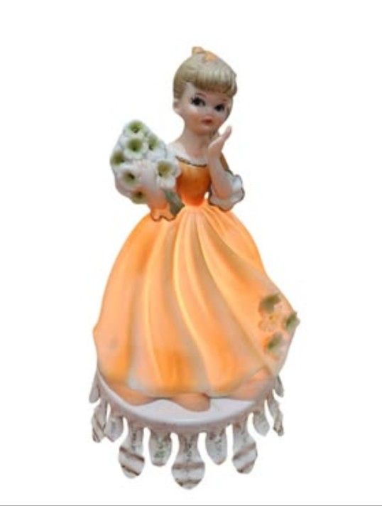 Vintage portable lamp. Underwriters Laboratories. Issue No. C-7998. It measures approx. 8 inches tall x 5 inches across the bottom. Featuring a teen girl wearing an orange dress and holding a bouquet of green flowers. Made of porcelain with a metal base. In perfect condition. No chips, cracks or damage. #vintagenightlight #nightlight #Princessdecor #girlydecor