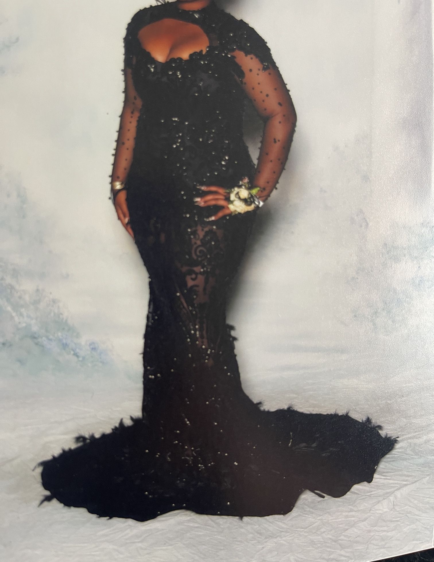 An exquisite custom, hand-beaded couture gown that embodies timeless glamour and refined sophistication. Featuring thousands of meticulously hand-applied beads, lace up back corset, this gown shimmers beautifully across a sheer illusion bodice and sleeves, creating a flawless, figure-sculpting mermaid silhouette. The dramatic feather-trimmed train adds couture drama, making every entrance unforgettable. Just like new and worn once, this gown remains in pristine condition, offering rare luxury at an exceptional value. ✨ Details: • Custom hand-beaded craftsmanship • Sheer illusion bodice & sleeves • Sculpted mermaid silhouette • Dramatic feathered train • One-of-a-kind couture design • Just like new — worn once 💎 Selling Price: $700 For the woman who wears elegance effortlessly and leaves a lasting impression.