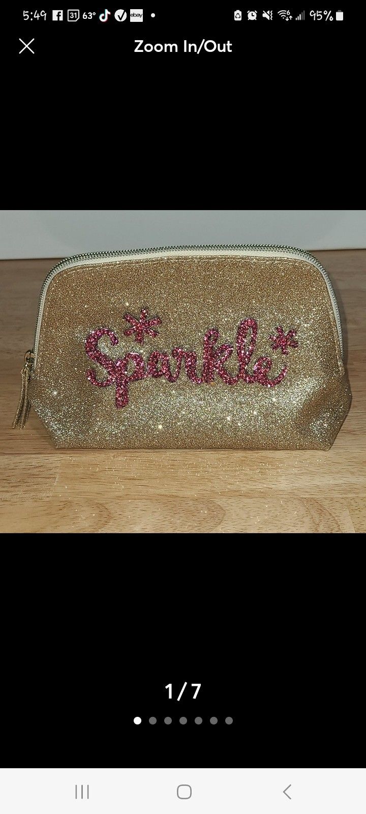 WHAT YOPU WILL RECEIVE... A GOLD GLITTER MAKE-UP BAG WITH THE WORD "SPARKLE" WRITTEN IN FUSCHIA PINK! The bag originally Bath & Body Works products in it, but I used the products. I have no use for the bag. The bag is in excellent condition. The bags zippers and unzippers and is intact. The measurements can be seen in the pics. OUTSIDE OF BAG: LENGTH: 7.5 in. WIDTH: 5 in. HEIGHT: 5 in. Outside of bag and measured inside of bag. INSIDE OF BAG LENGTH: 6 in. 4 BLACK MAKE-UP MICROFIBER CLOTHS, 2 MAKE-UP ERASER CLOTHS, & 2 OPENED PACKAGES OF COSMETIC WEDGES. - In unopened package 4 Black Microfiber Remover Cloths by Nifty. This is an unopened package. - 2 Make-up Eraser Cloths, 1 is in a coral color, the other is fuchsia pink color. They are out of the package, and have never been used. - 2 Opened packages, each package reads "Contains 28 pieces." Between both packages, you will receive approximately 40 individual triangle white make-up wedges. Please ask any questions or if you would like more pics.