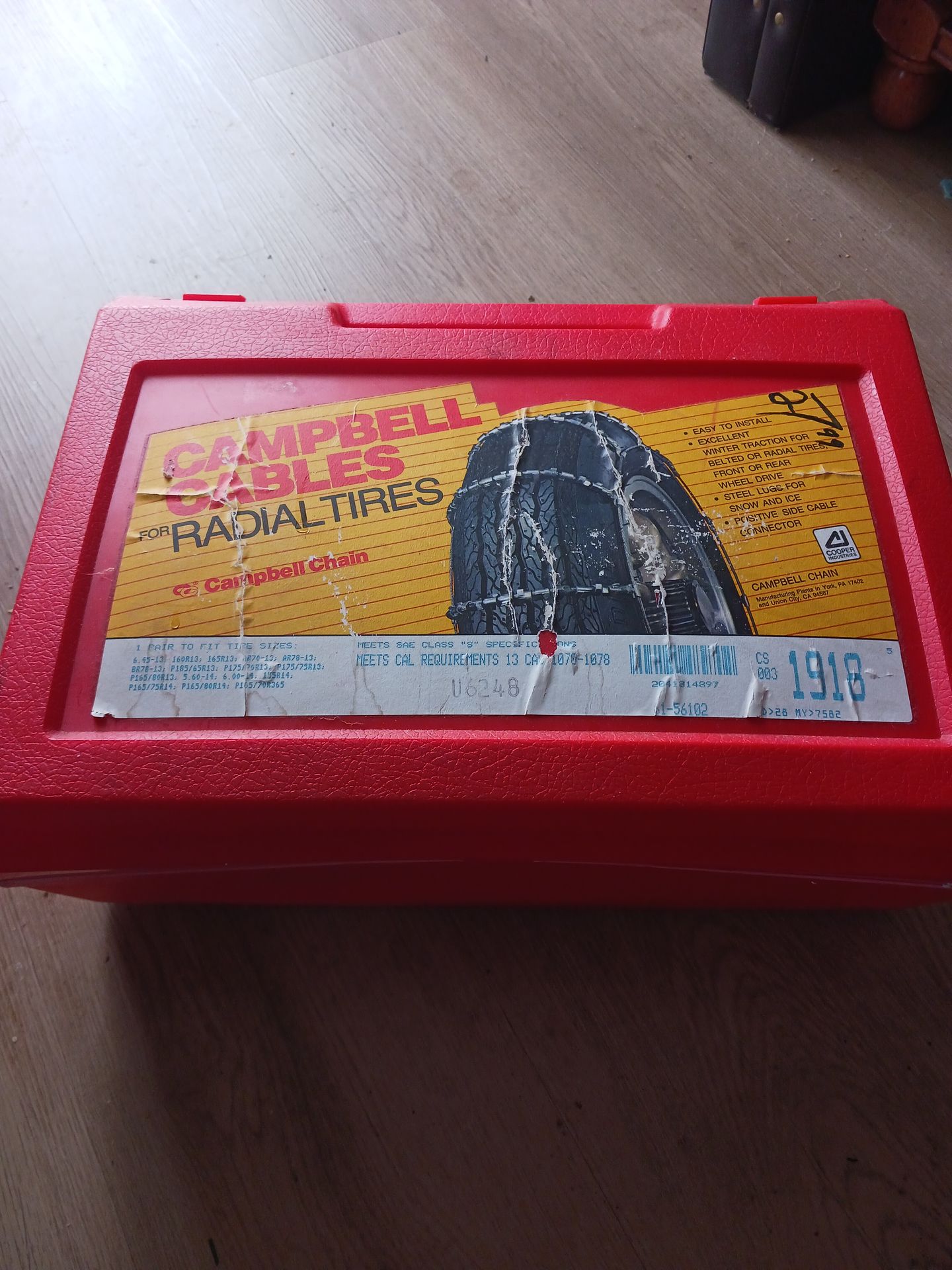 Snow/Sand/Mud chains (1 pair) Use on drive wheels (Front OR Rear) to keep you from getting stuck in mud and snow OR to get you unstuck. Fits narrow 14" Radius tires (R14), narrow 13" tires, or wider tires 13" or less. See photo with list of tire sizes for on-road use. If your tires are taller than 14" or shorter than 13" then you should only use these tire chains off-road. Includes tightening tool and carrying/storage box. These chains are the cable-and-tooth type. They are in very good condition. No rust. No frayed cables. Nothing bent or broken. Tire chains, themselves are like new. The labels on the outside of the storage case are a little faded, but still readable. PRICE REDUCED. I understand most people don't need these tire chains, and I no longer have a vehicle with compact wheels, so I've dropped the price from $25 for the pair to only $17 ($17 total is for both chains, the install tool, and the case, which is worth $5 by itself!) just to pass these chains on to someone who needs them. UPDATE: I've decided that case would be perfect for my battery jumper cables, so... I'll give away the 2 tire chains and the install tool for ONLY $12, IF you let me keep the plastic case.