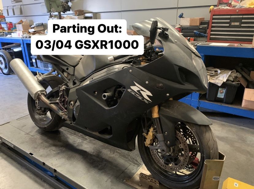 Parting out a 2003-2004 GSXR1000. For parts requests, give us a call at the shop and we will gladly help you out! Shop number is shown in the last picture. Southern California Motorcycle Dismantlers 15864 Arrow Blvd. Fontana, Ca. 92335 Monday thru Friday 8 to 5, Saturday 9 to 3