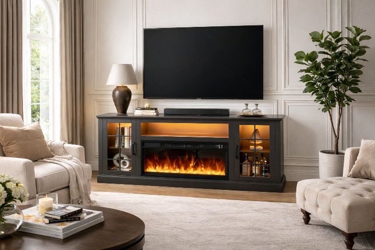 TV Stand with Led and Power Outlets, Black Entertainment Center with 26" Electric Fireplace for 58 inch TVs, Modern TV Console with Storag