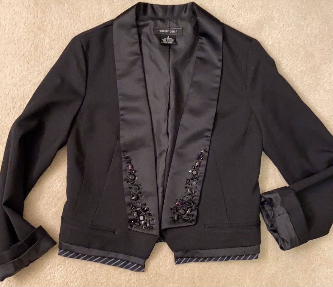In excellent condition. Black. One hook and eye closure. Bejeweled. Cropped length. True to size s. Length 19”. Shoulder 13.25”. Chest 16.5”. Sleeve 21.5”. Measured flat on the ground. From South Korea. Pick up near Wholefoods in Tyson’s corner please