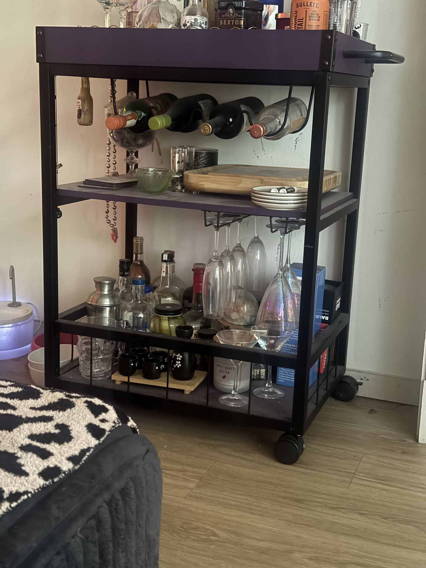 Ashley bar cart! I bought it brand new and painted it purple it can be painted any other color. It’s super functional with wheels and it’s pretty large! I don’t drink anymore so getting rid of.
