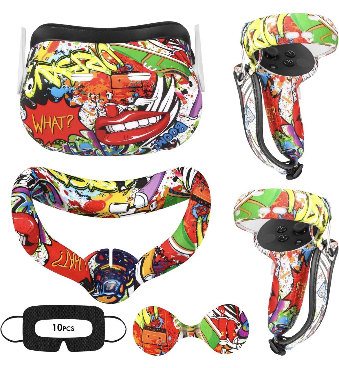 Accessories for Oculus Quest 2, YIZEIJOB VR Protective Silicone Cover Skin Set Compatible with Meta Quest 2 - Street Graffiti Features & details 🔥【Unique Street Graffiti Pattern】Exclusive colorful street graffiti pattern, give your quest 2 a new look and make it the most eye-catching device ever! each pattern is non-repetitive, making your Quest 2 a unique existence! It's also an ideal gift for your friends who owned quest 2!!! 🔥【Full Protection for Oculus Quest 2】This 5-in-1 quest 2 accessories bundle is specially designed for meta oculus quest 2, which can provide perfect full-body protection for your device from scratches and other accidental damage. 🔥【No Cooling Obstruction, No Signal Blocking】The surface of the front shell cover and controller grips cover is designed with multiple cooling holes and precise signal connection holes that will not block the signal connection and heat dissipation of the quest 2 headset. 🔥【Made of Improved High-Quality Silicone Materials】Our silicone cover set is made of improved high-quality materials. new lightweight, durable and eco-friendly molecular silicone materials without a pungent smell. Such a great quest 2 accessories you must have one! 🔥【What Can You Get From This Quest2 Accessories Set】The occlusion quest 2 accessory bundle includes 1* headset front shell cover, 1* anti-sweat face cushion cover pad, 1* VR camera lens protective cover, 2* quest 2 touch controller grips silicone skin cover, 10* disposable eye mask cover and satisfactory service.
