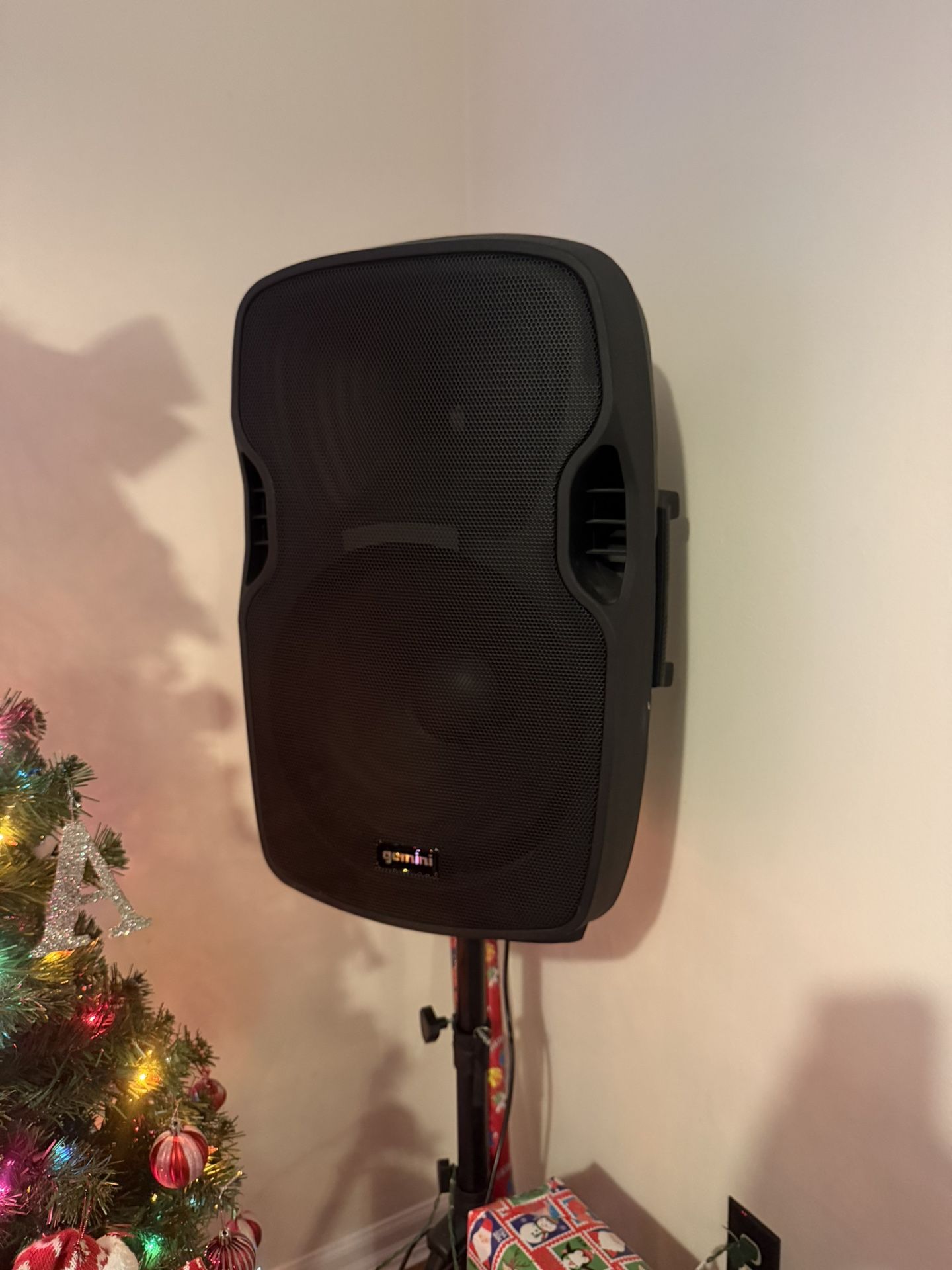 Works great, connects to blue tooth, loud speaker, heavy duty and comes with microphone for karaoke