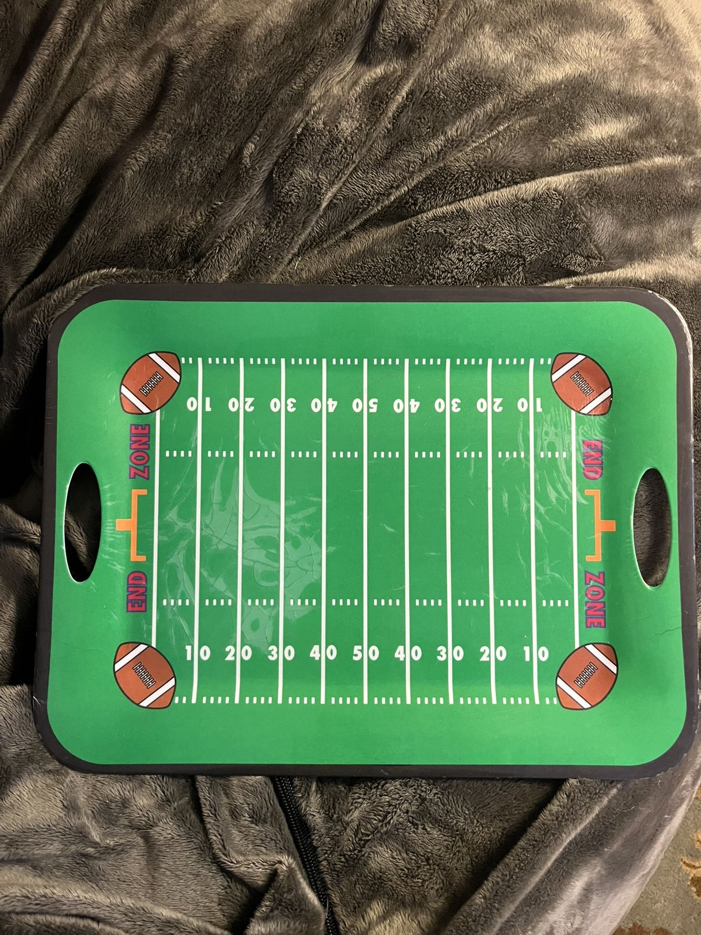 Green football field serving tray. Has yard lines, end zones, and football graphics. Built-in handles on the sides. Measures about 19-20 inches long and 12-13 inches wide.