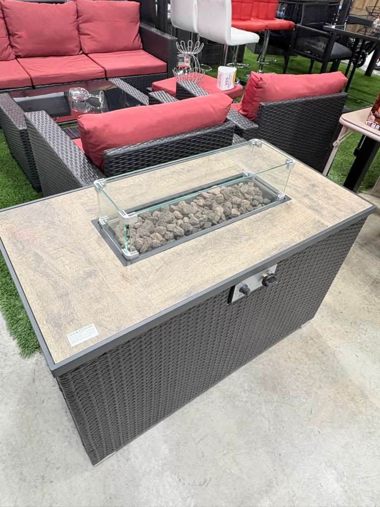 Brown 43 in. 50000 BTU Rectangular Propane Outdoor Fire Pit Table with Glass Wind Guard Lid, Lava Rocks and Cover New in a Box - Nuevo en su Caja Extended Warranty Available - Ofrecemos Garantia Extendida 1-year Warranty -1-Ano de Garantia We do Financial - Hacemos Financiamiento 10117 NW 87 Ave Medley, FL 33178@.@@@@@@.