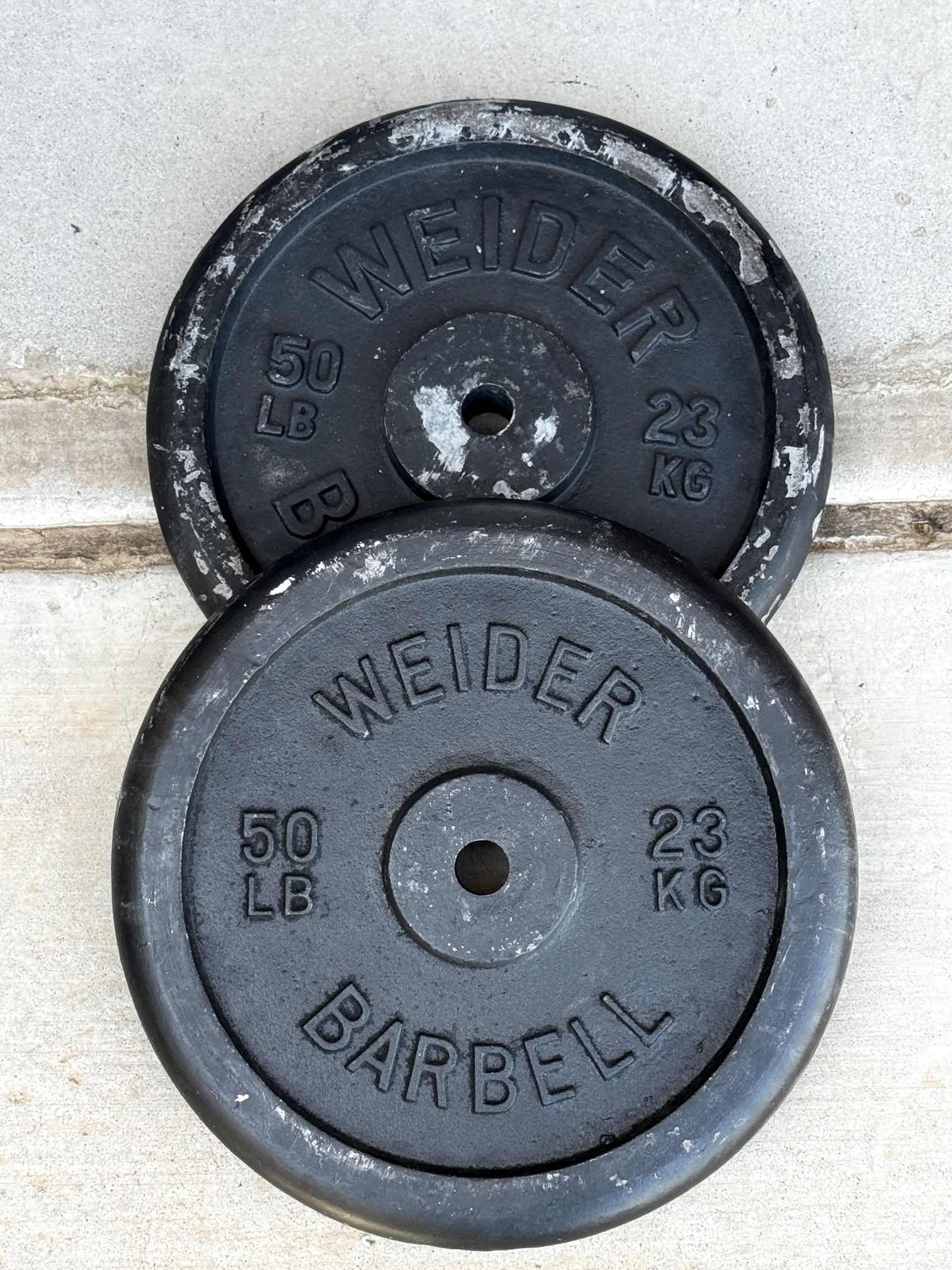 Two Weider 50-lb weights for sale. Cast iron from the 90s. Standard hole, no rust.