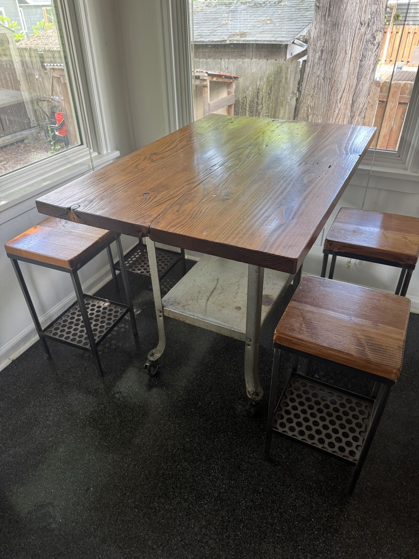 It you are reading this ad the table is still available Custom bar height table and 4 bar stools. Beautiful wood top with a couple blemishes, but overall in great condition. Table dimensions: Height 37in Width 33in Length48in Locking roller wheels for easy mobility. Polyurethane protective coating on wood surfaces. This was fabricated for me by a small Portland company that unfortunately isn’t still around and I am only parting ways as I do not have the space for it anymore. Great table and home to many great meals, card games, conversations, morning coffee and evening tea.