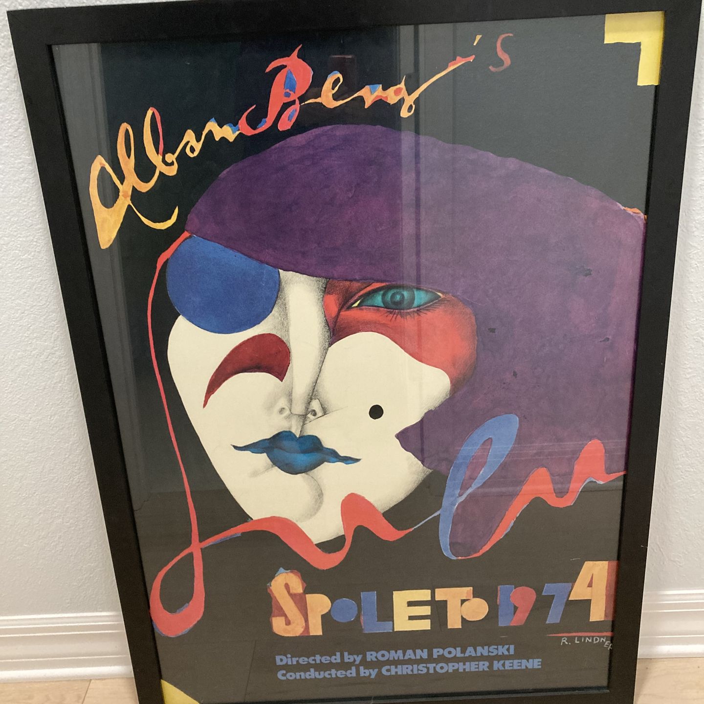 Spoleto Festival artist Richard Linder 1974-black frame see photos for slight blemishes. Large -44 inches high and 32 wide. Advertises Albion Berg opera Lulu at Festival deli Due Mondi in Spoleto Italy.