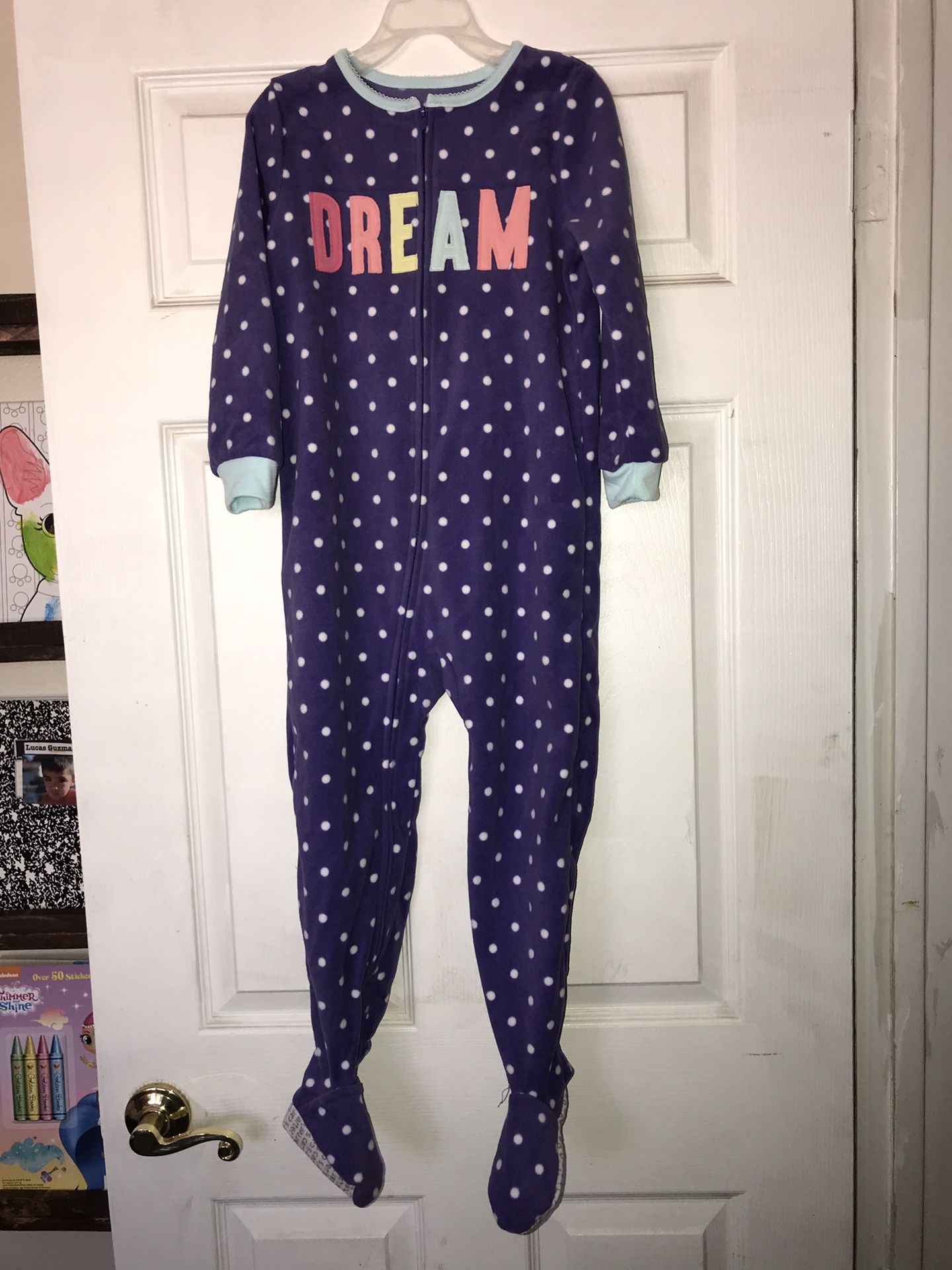 This is a size 5 footed fleece pajama from Carters. It doesn’t have the tag but it is new & never been used before.