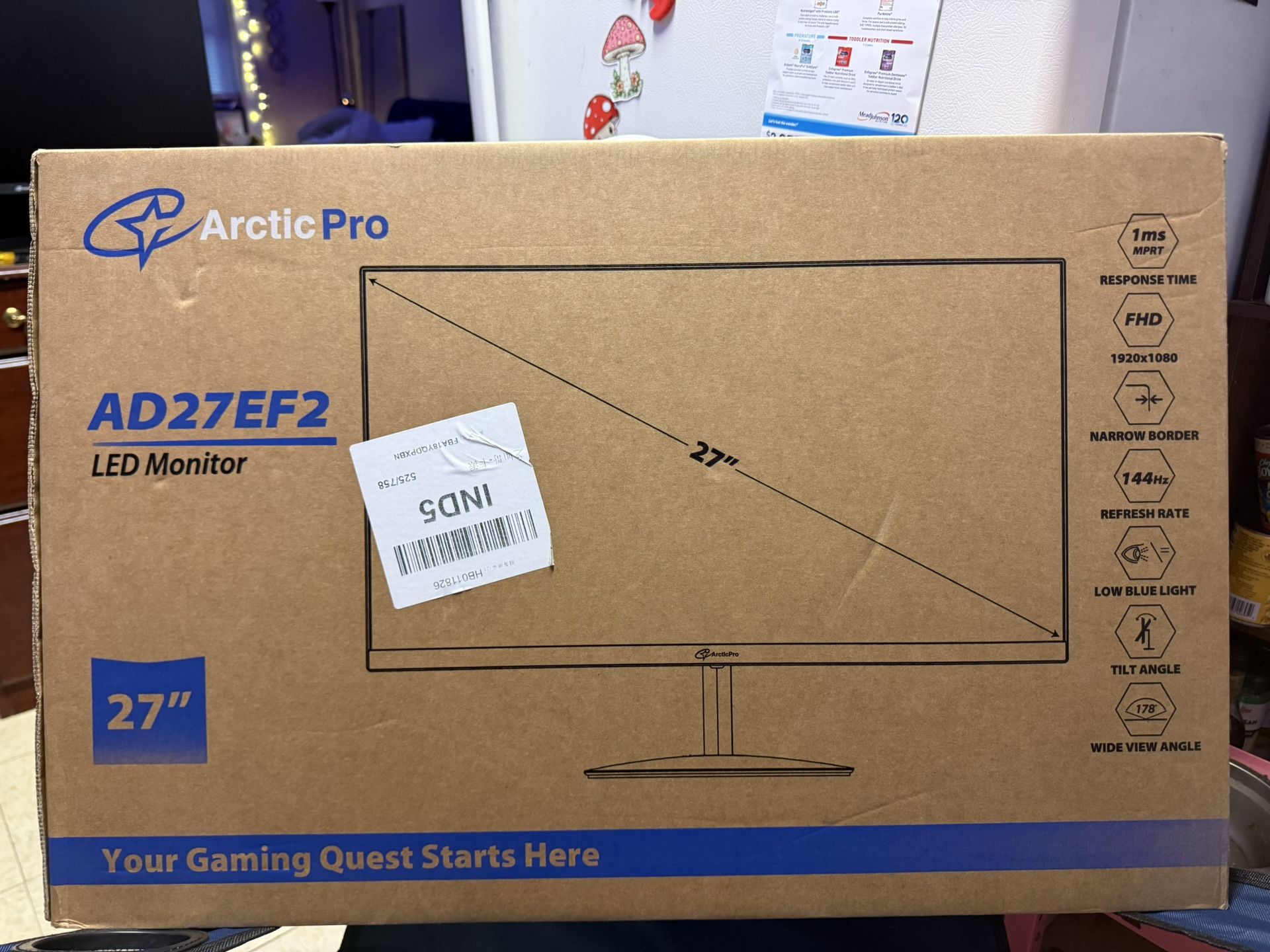 New and never out the box SPECS: Brand ArcticPro Screen Size 27 Inches Resolution FHD 1080p Aspect Ratio 16:9 Screen Surface Description Matte Image Contrast Ratio 1000:1 [Full HD Resolution] Enjoy the crystal-clear image quality of ArcticPro monitor with a sharp 1920x1080p Full HD resolution, providing more vivid colors and sharper details for an immersive viewing experience [Smooth Performance] With a 144Hz refresh rate, fast response time and Low Blue Light, ArcticPro monitor delivers smooth and better gaming experience [IPS and Wide Color Gamut] With Wide color gamut and 110% sRGB, 72% NTSC, IPS panel for wide viewing angles and 3-sided frameless design; It meets the designer's demand of image texture [ Anti-blue light design] With Anti-Blue technology, ArcticPro monitor delivers smooth, tear-free and eye care visuals, minimizing motion blur and ghosting for an immersive gaming experience. [VESA Wall Mountable] With 75*75mm VESA wall mount pattern, you can select the best viewing position, and ArcticPro monitors also support multiple signal inputs such as HDMI, VGA