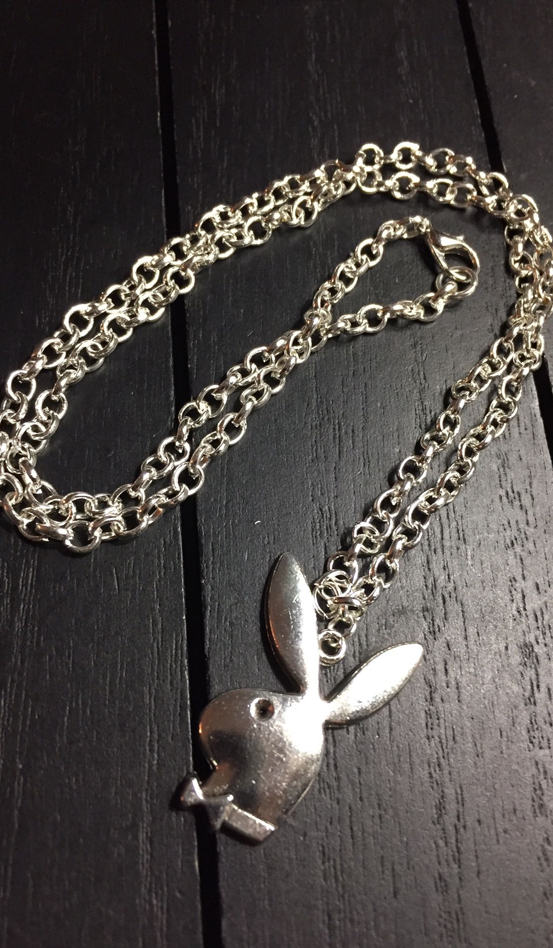 New, never worn. The chain is made of a shiny steel alloy. The play boy is made of Antique Silver Alloy. Chain length: 20” (or text us for more sizes) Check out our page and follow us for more jewelry.