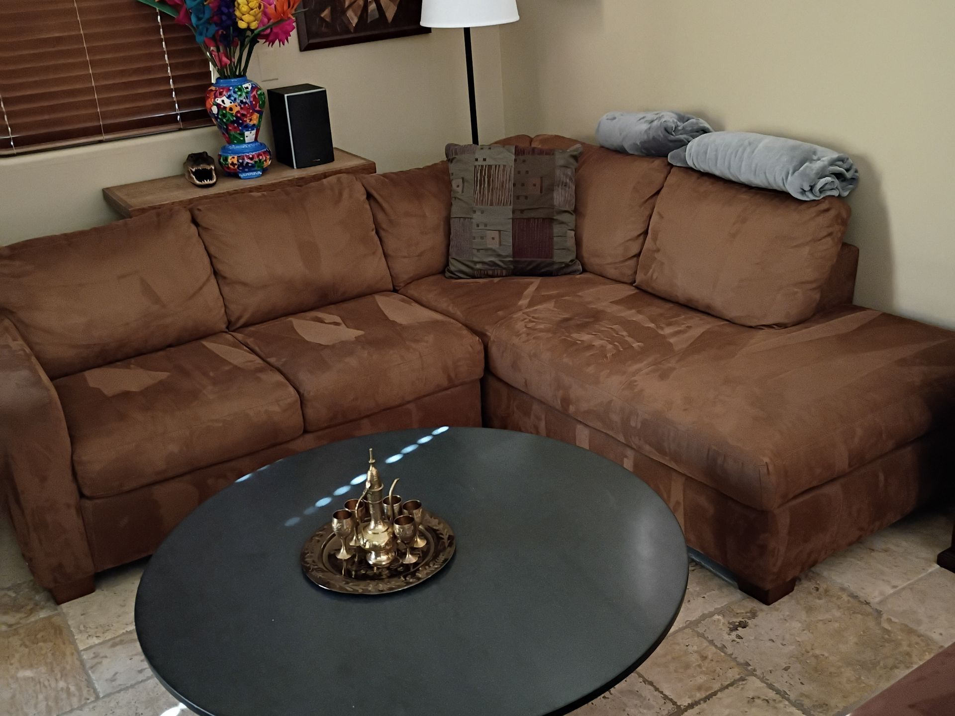 Sectional sofa. Dimentions: 84 inches by 75 inches. Light brown color. Two sections. Tight cushions.