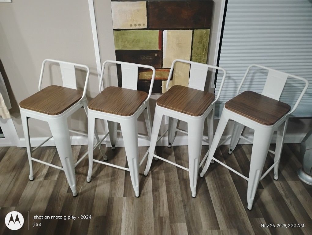 *BLACK STOOL SET STILL IN BOX BRAND NEW NEVER OPENED!!!! Asking: $100.00 *WHITE SET OPENED & LIGHTKY USED SHORT PERIOD OF TIME & SAT IN MAYBE 2Xs ONE OF THEM. PERFECT CONDITION!!!! Asking: $80.00 *2 Stool Sets available!!!! *One in black & one set in white *Comes with 4 stools in each set *¡¡¡¡YOU CAN HAVE THEM WITH OR WITHOUT A BACK....CHECK OUT THE PHOTO EXAMPLE WITHOUT A BACK - ITS A BACKLESS STOOL!!!! *The black set is completely brand still in the box . *Both sets are 28" stool or 24" seat height from floor or Standard counter height stool *Paid $150.00 for all four white stools & another $150.00 for all four black stools. *Asking price $80.00 for white set* *Asking price $100.00 for black set* FIRM