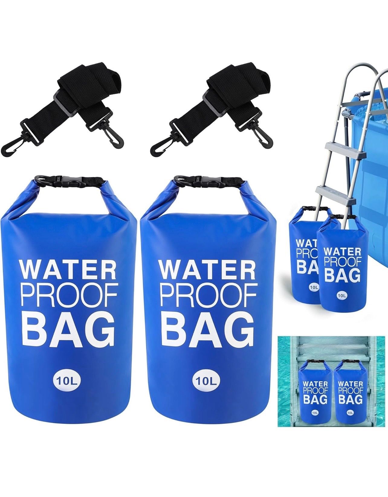 BRAND NEW 2 Pcs Universal Pool Ladder Step Weights 500D PVC Swimming Pool Ladder Weights 10L Waterproof Dry Bag Pool Weight Sand Bags with Heavy-Duty Nylon and Handle Work with Above Ground Pool Steps • Easy and quick fill sand: the pool ladder weights have an opening of 7.5 inches for easy and quick sand filling, saving time and effort, 2pcs 10 liter pool ladder weights, maxi bearing weight up to 18 kg/ 40 lbs, ideal for removable pool ladders. • Quality thick material: the pool weight bags are made of heavy duty 500D PVC bonded mesh cloth, waterproof and durable, easy to carry, stain resistant and scratch resistant, not easy to break and crack, which can serve your swimming pool for a long time. • Good sealing and waterproof: high quality PVC waterproof material, with better air tightness and waterproof performance; High waterproof technology combined with high-frequency seaming technology to prevent water leakage, keep the sand in the bag dry, effectively solve the problem of sand scattered in the pool. • Wide application: suitable for most pool steps, stairs and ladders to prevent them from floating or swinging. It can be applied as a storage backpack for outdoor sports such as swimming and rafting, which can solve the problem of storing clothes and other items that need to be waterproof. It can also be applied as a bucket in outdoor camping and fishing activities. • Easy to use and store: fill the pool sandbags with sand or pea gravel, then fold the top over at least three times, fasten the buckles, and use the handles to lift and secure pool entry steps or ladders. When not in use, simply empty the pool stair weight bag, clean it with water, air dry and fold for storage without taking up too much space. Note:For better waterproof effect, please fold the bag down no less than 3 times.