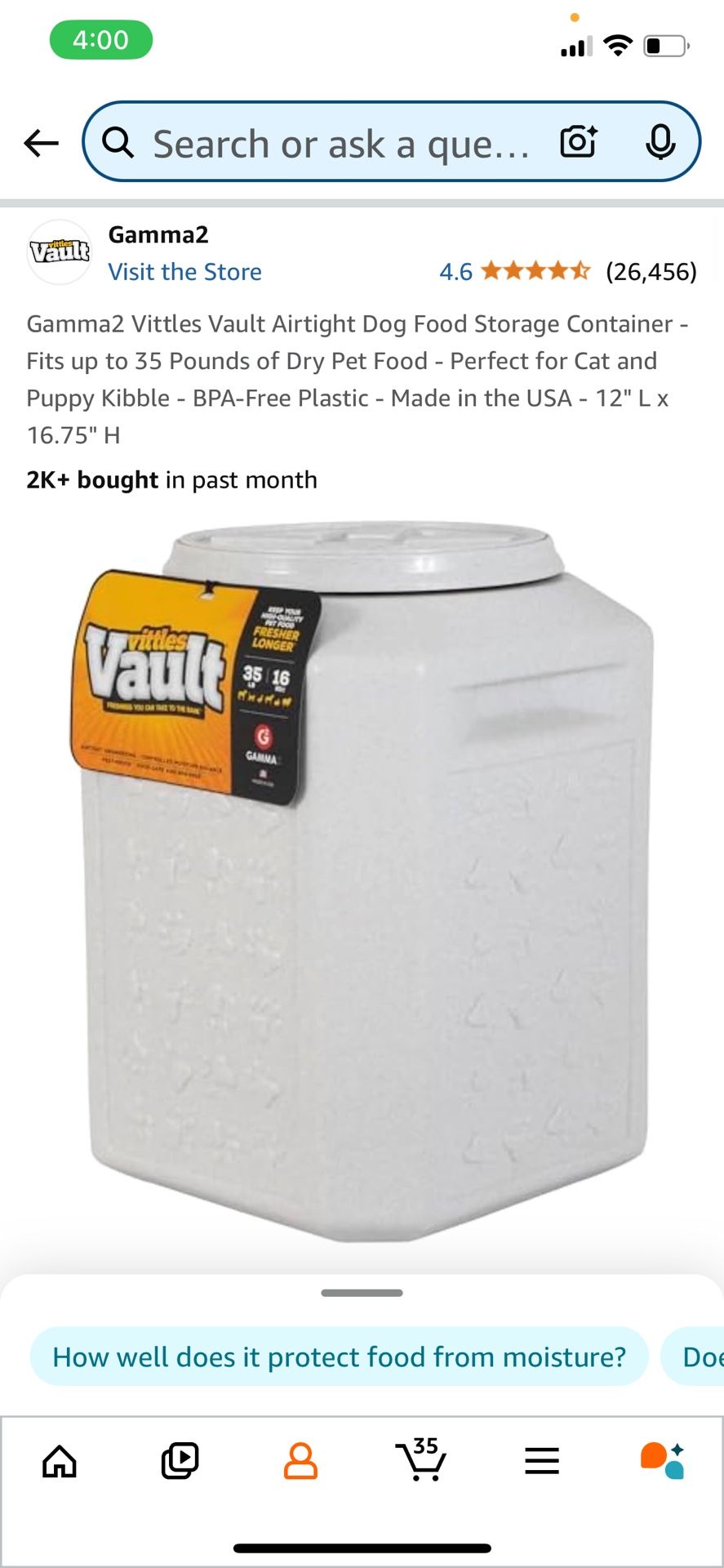 Holds up to 35 pounds of dog food Used for a year with no dents
